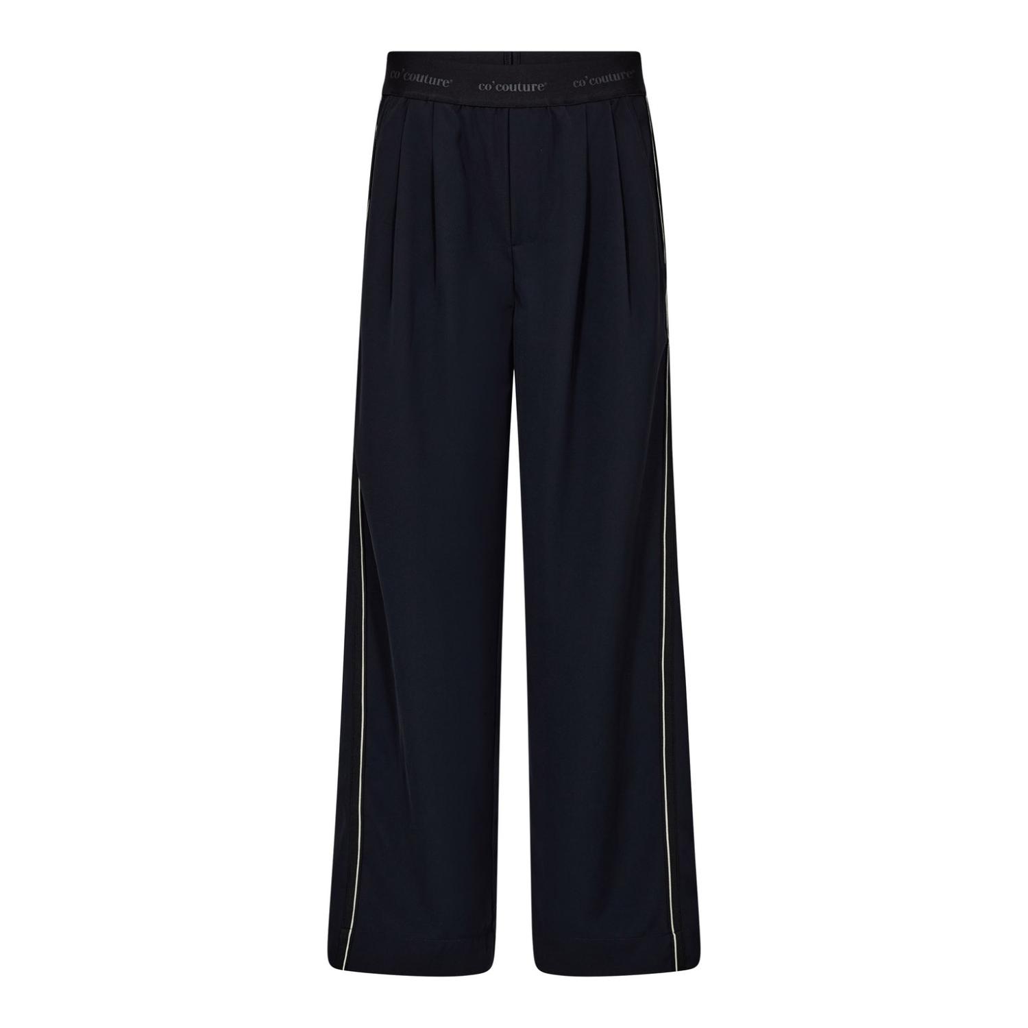 Svart byxa med långa rakvida ben, detaljerad med två vita revärer i sidorna.