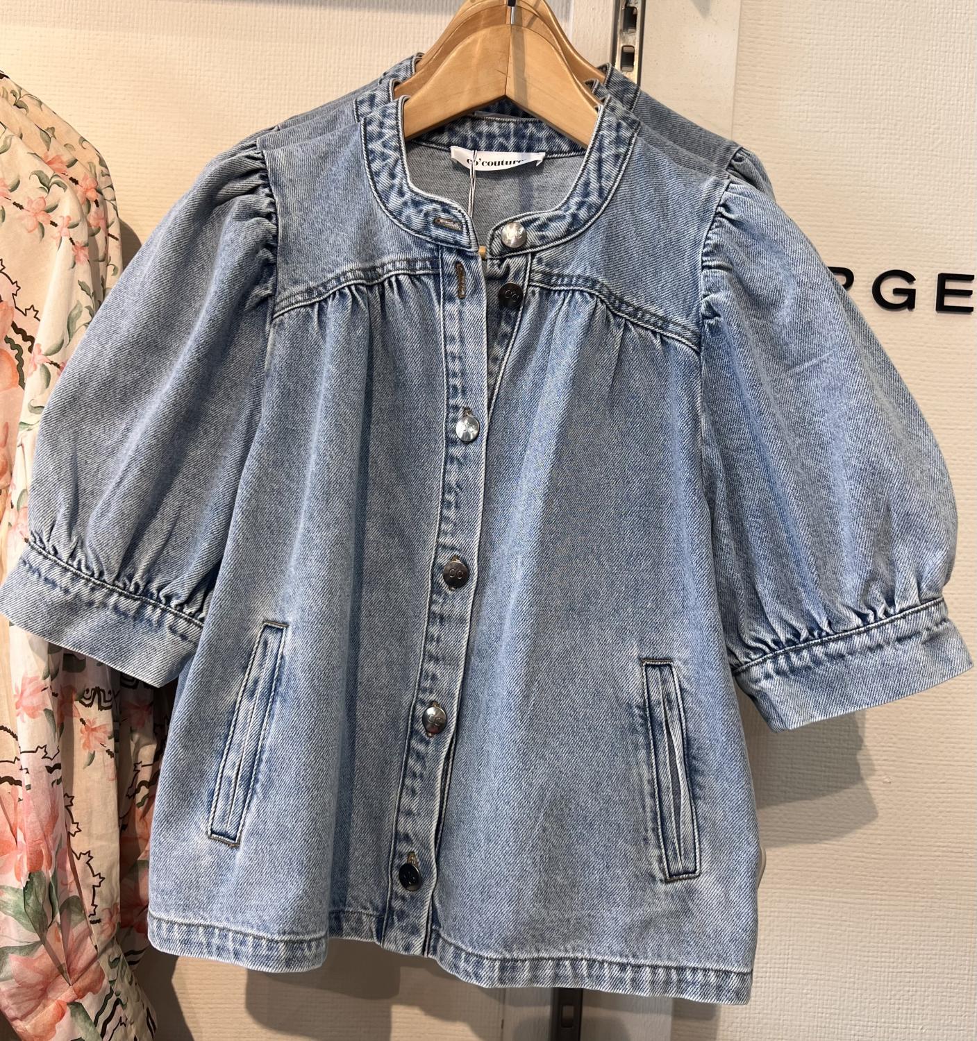 Ljusblå jeansjacka med kort puff ärm och knäppning fram.