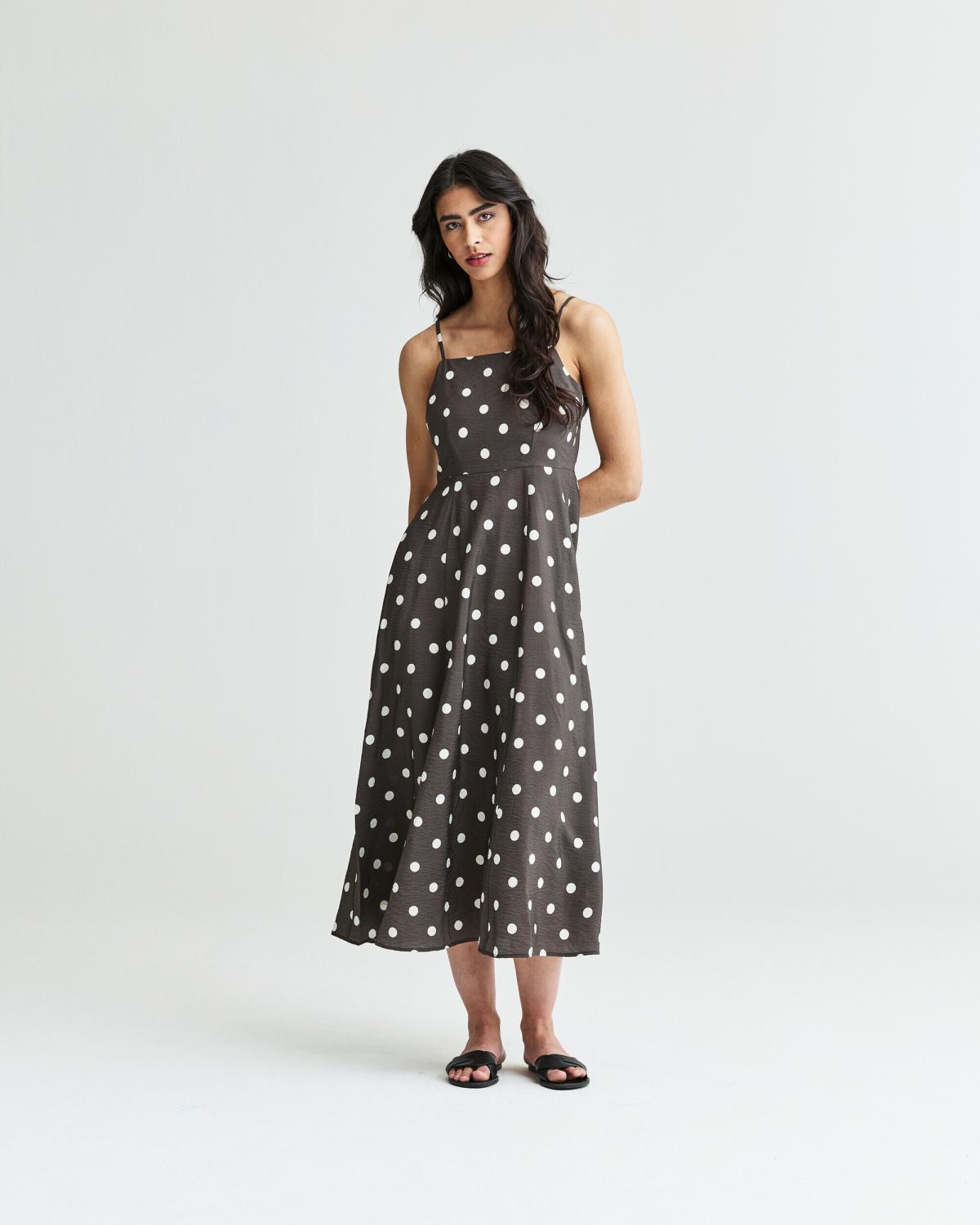 Mörkbrun vadlång klänning med utsälld kjol, samt mönstrad med vita prickar.