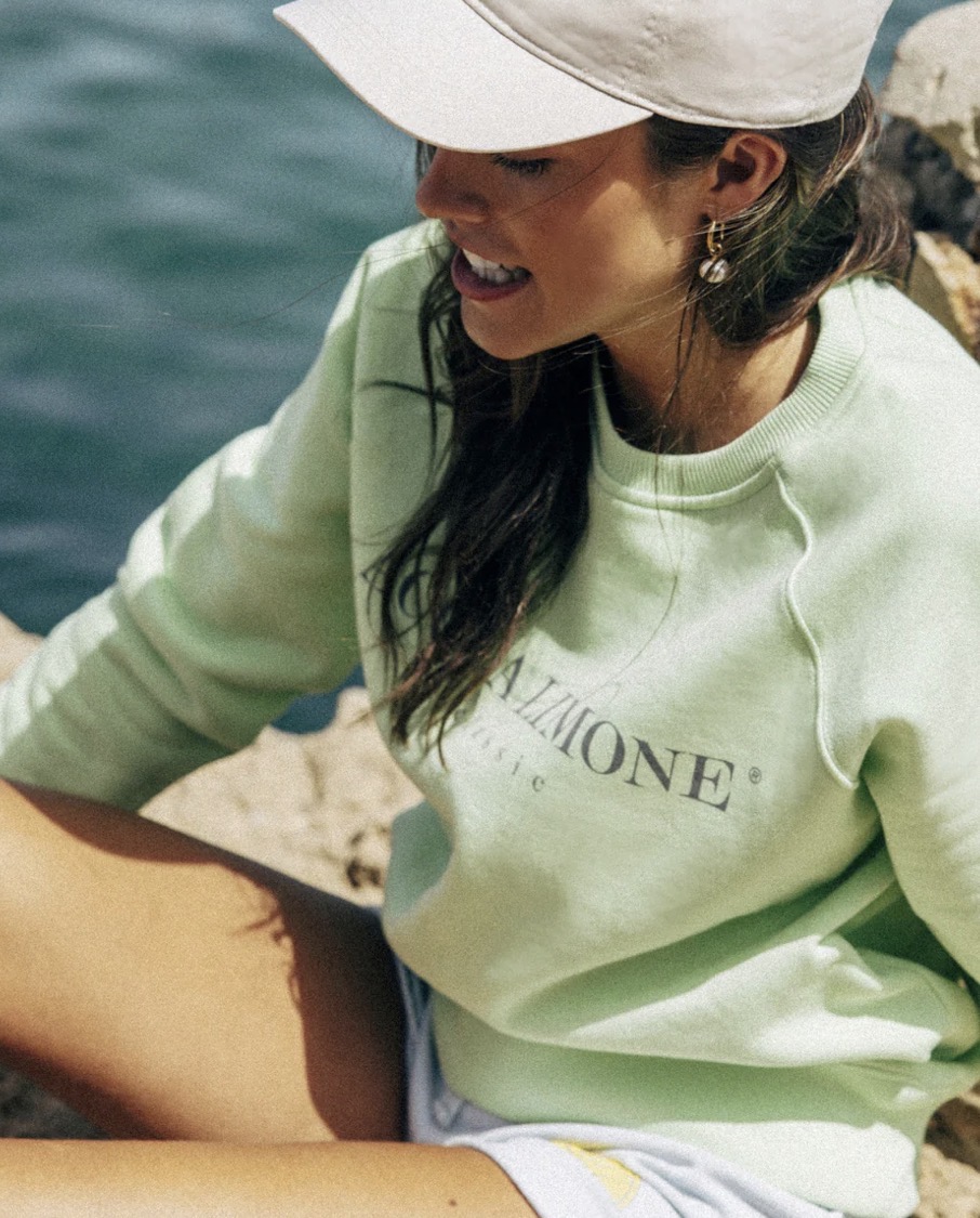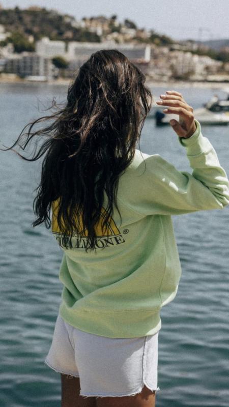 Sommargrön collegetröja i kraftig skön bomull med en citronskiva tryckt på ryggen och text fram på bröstet.