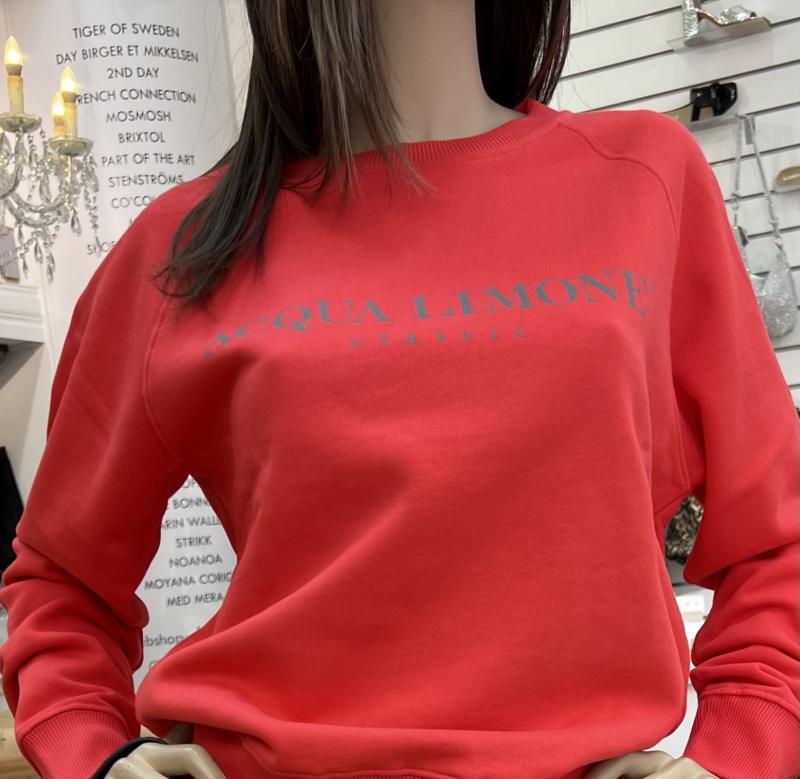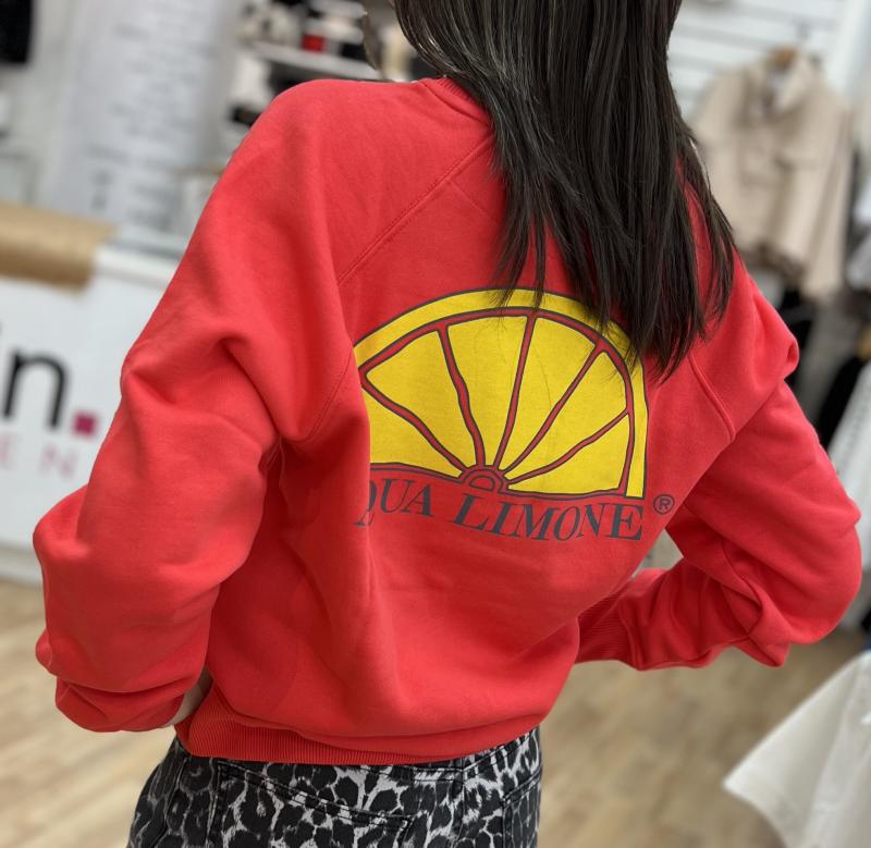 Starkt röd college med citron på ryggen och text fram på bröstet.