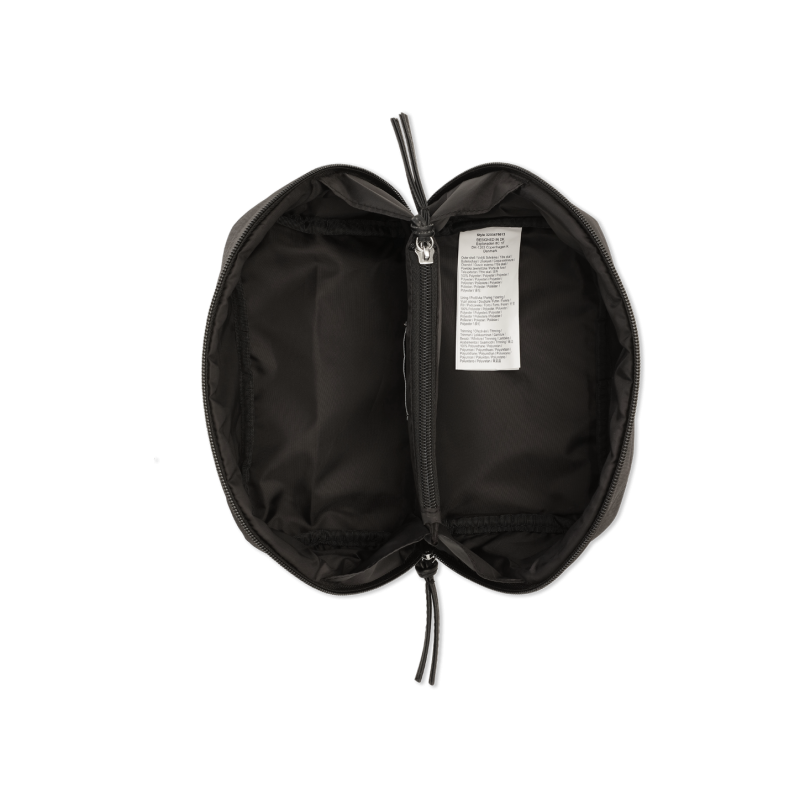 Svart sminknecessär med en dragkedja på diagonalen.