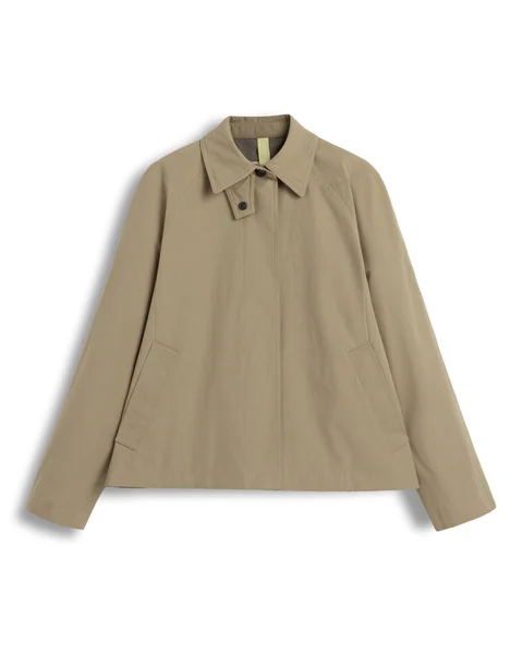 Kort vattentät jacka i khaki med dold tryckknappstängning fram samt en extra tryckknapp i kragen.