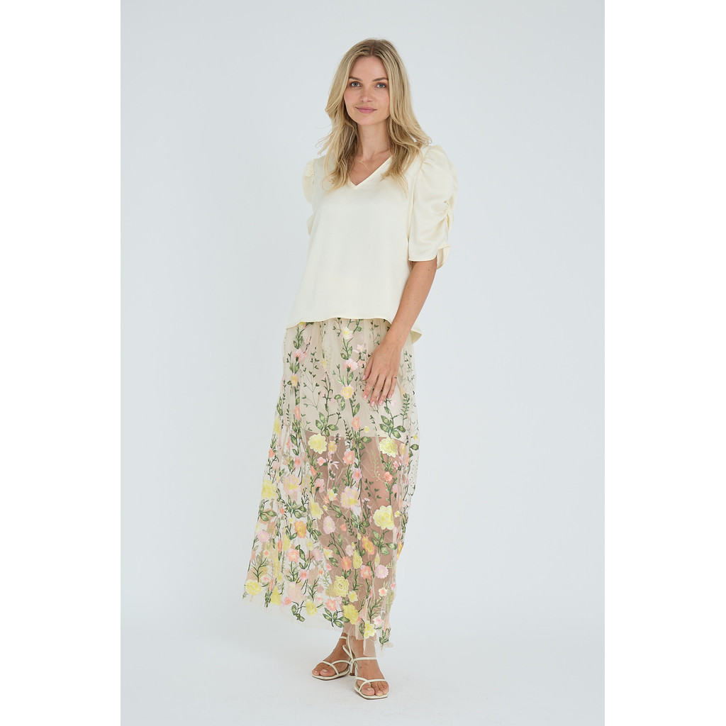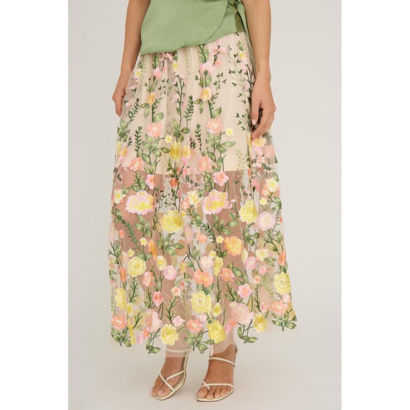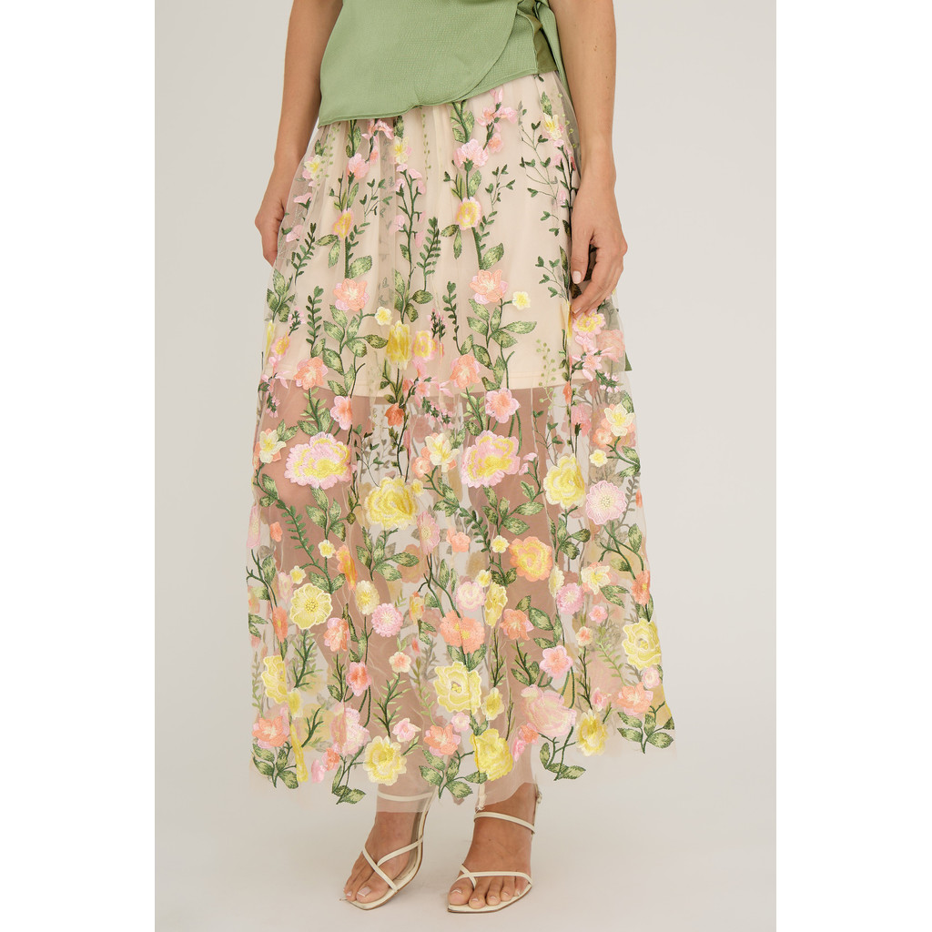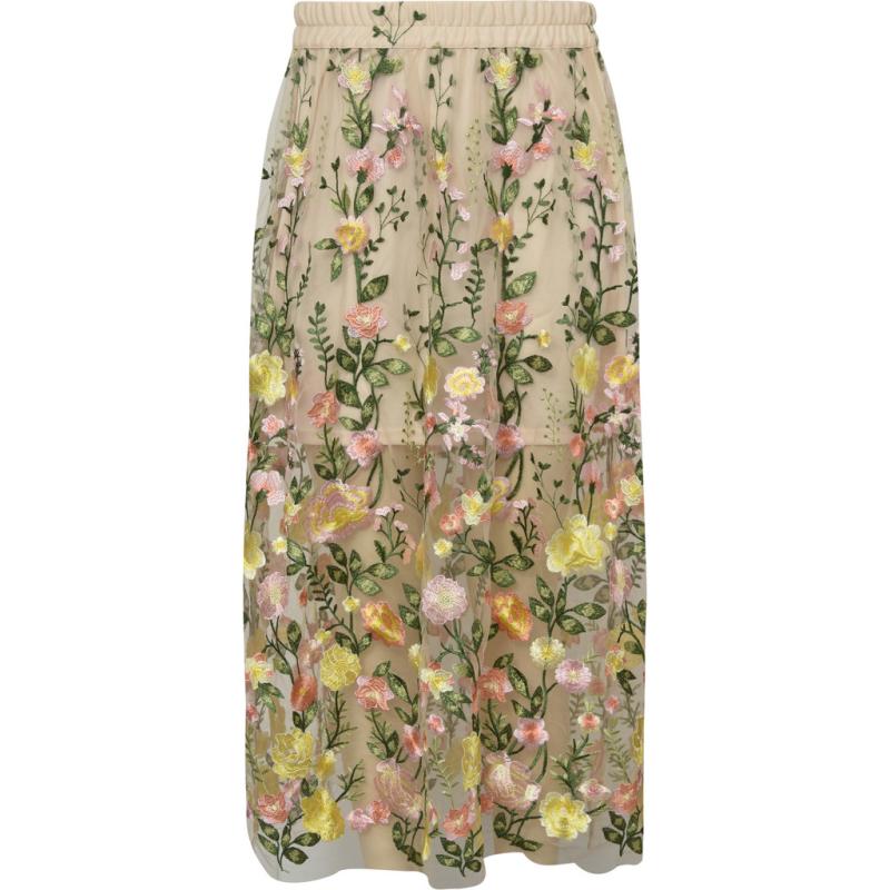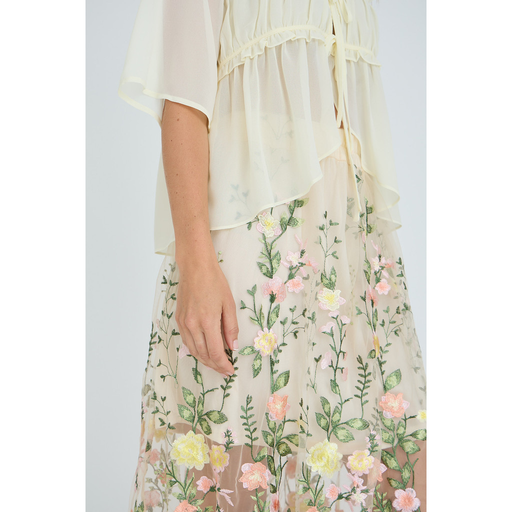 Ljusgul transparant kjol med blommiga broderier i gult/grönt/rosa.