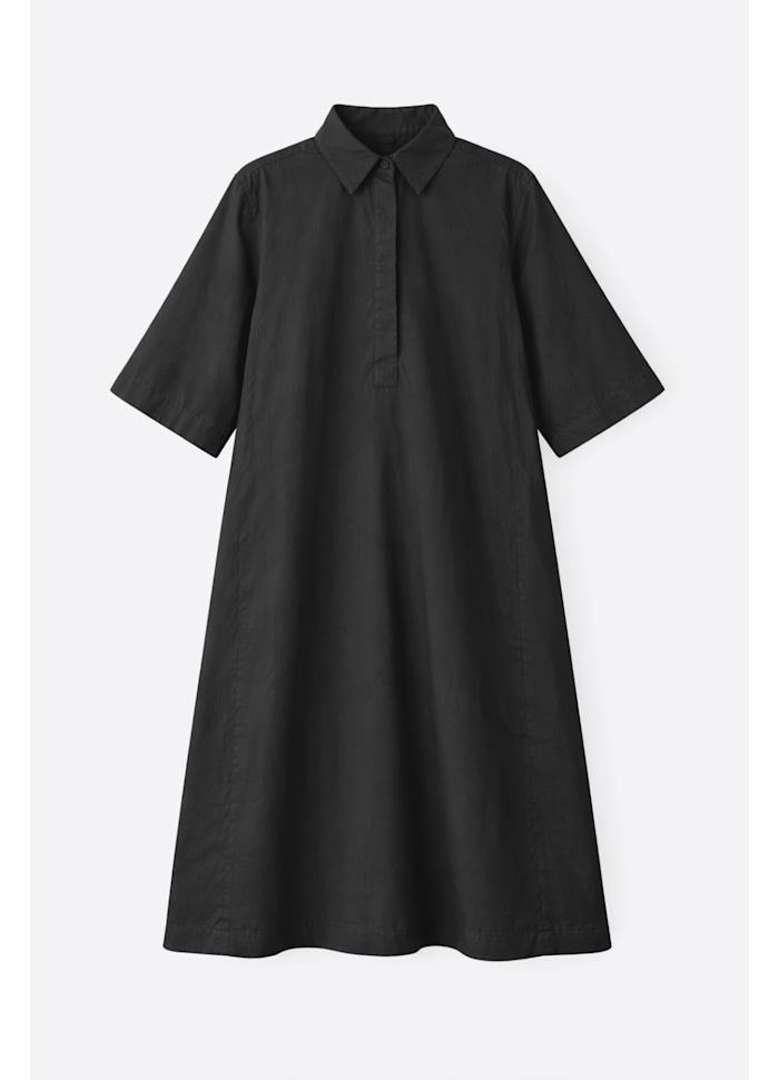 Vadlång svart skjortklänning i avslappnad passform med vid kort ärm.