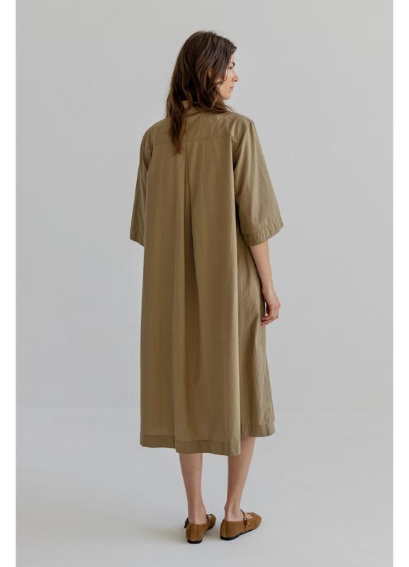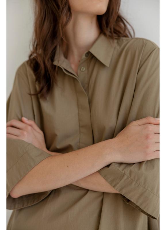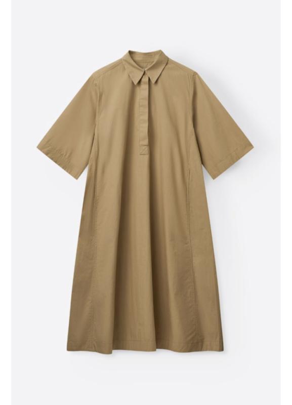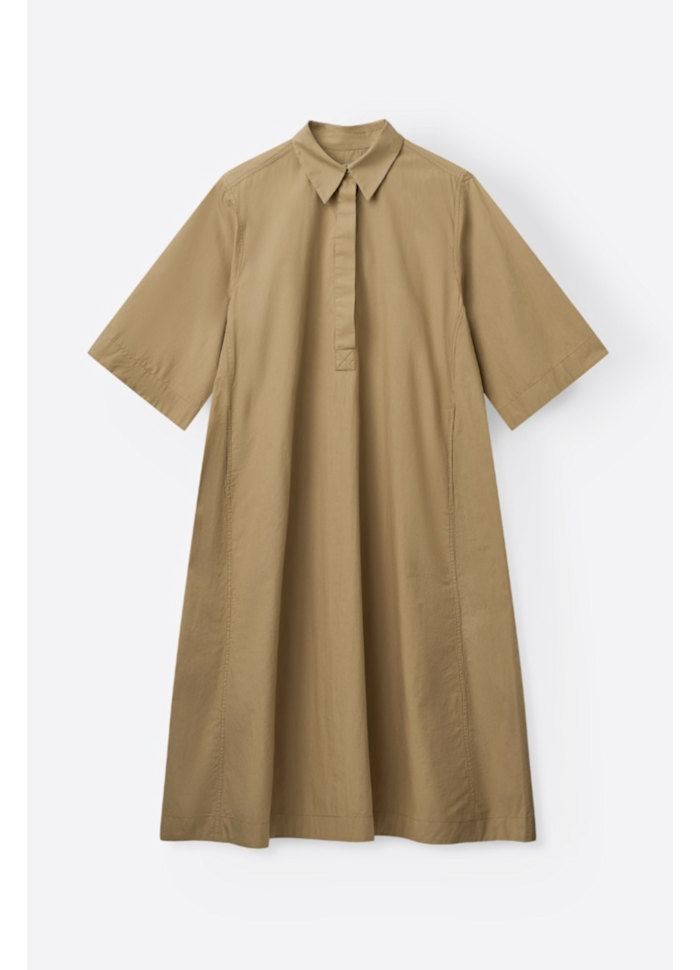 Vadlång khakifärgad skjortklänning i avslappnad passform med vid kort ärm.