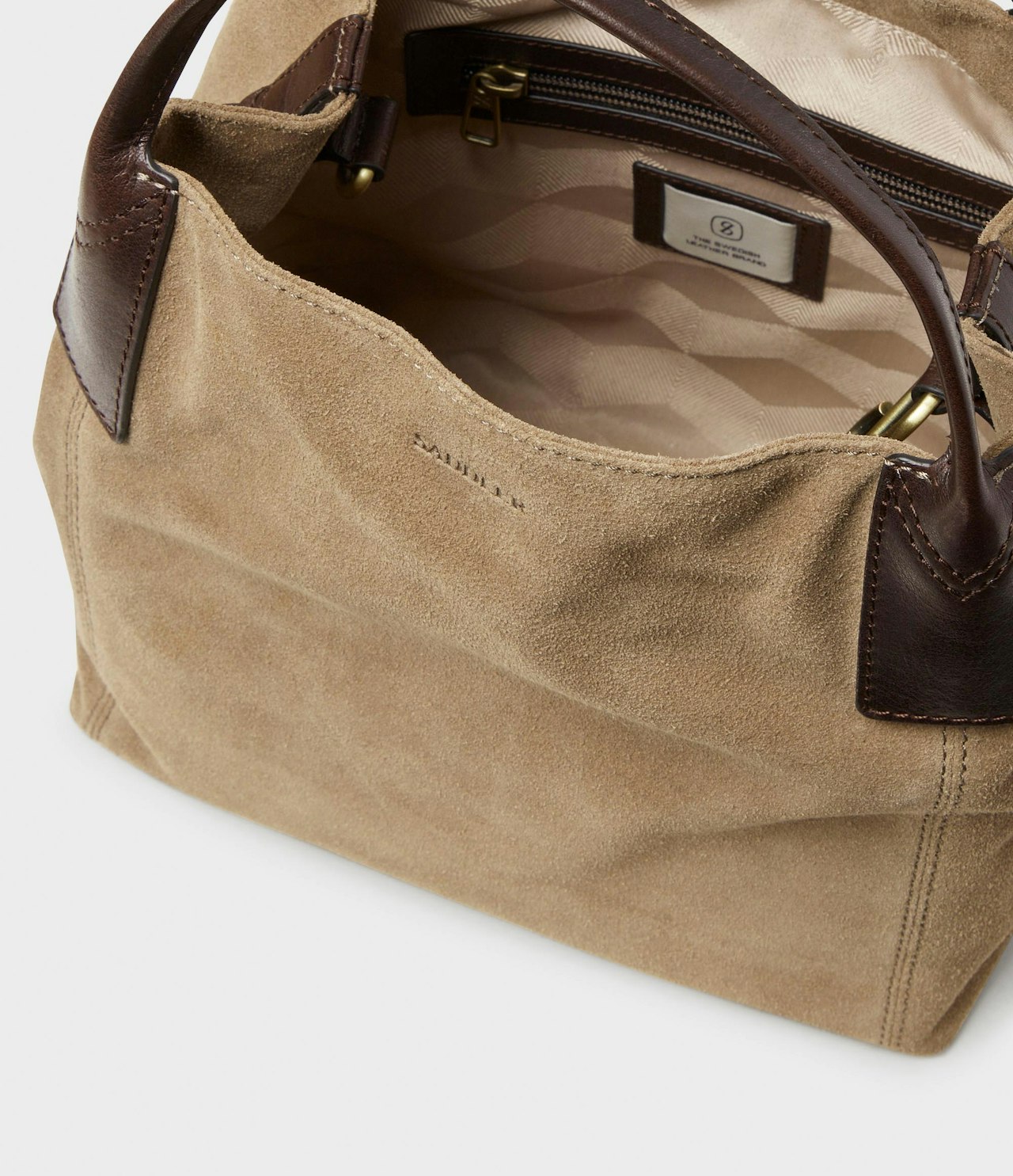 Liten brun toteväska tillverkad i mocka, certifierat av Leather Working Group. Invändigt finns en dragkedjeficka och två öppna fickor samt en hake för att justera väskans form. Insidan är fodrad i 100% polyester. Väskan försluts med magnetstängning. Justerbar axelrem med en längd om 100–120 cm. Hårdvara i antikt mässingsfärgad metall.