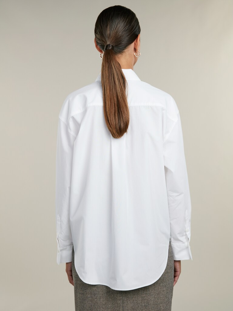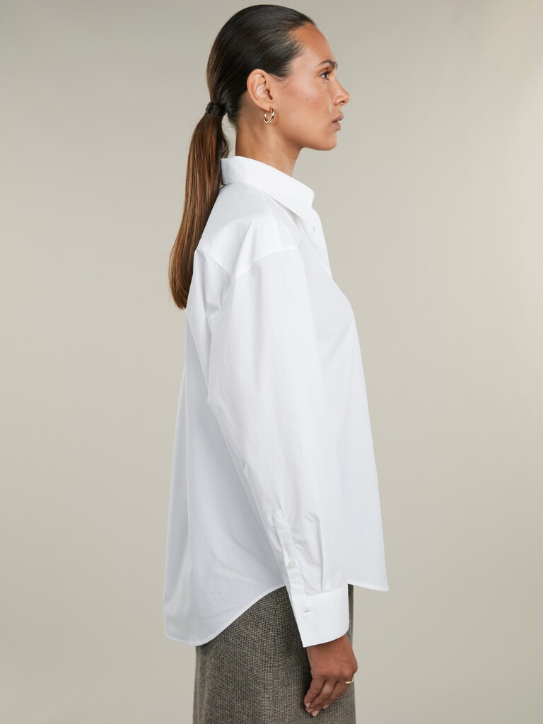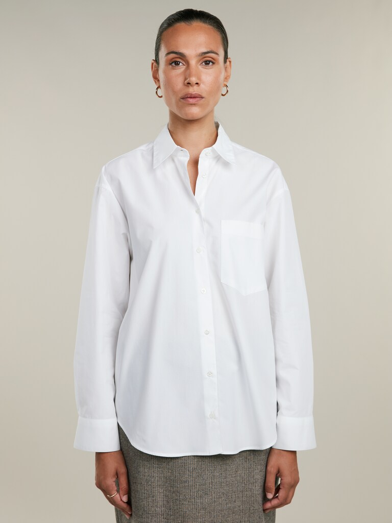 Vit skjorta i avslappnad passform med klassisk krage och vita pärlemoknappar.