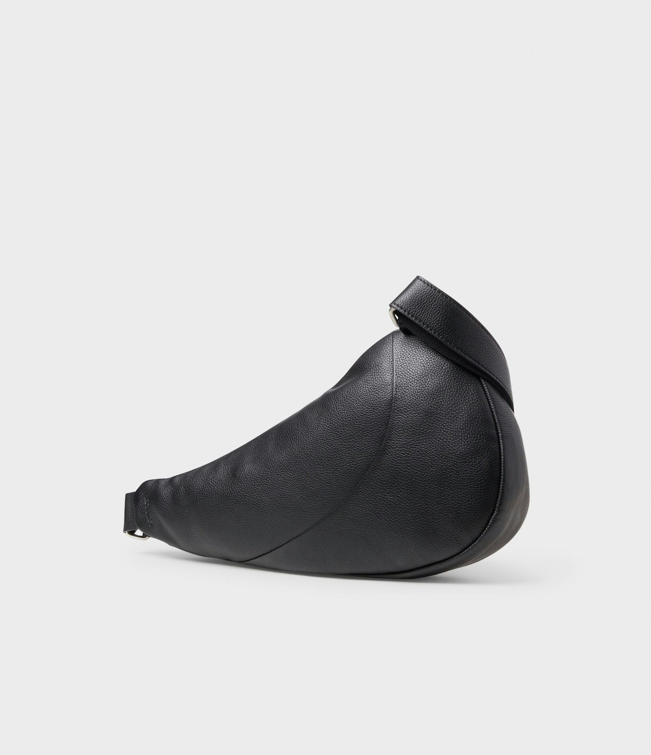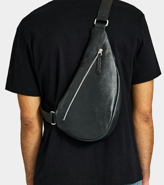 Svart axelremsväska tillverkad i full grain koläder, certifierat av Leather Working Group. En öppen ficka och en ficka med dragkedja inuti. Insidan är fodrad i polyester. Väskan försluts med metalldragkedja. Justerbar axelrem med en längd mellan 57–107 cm. Hårdvara i matt nickelfärgad metall.