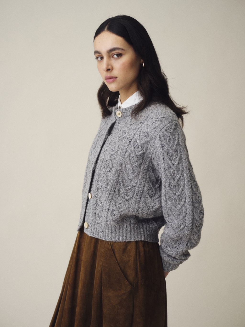 Gråmelerad kabelstickad tröja med knappar framtill.