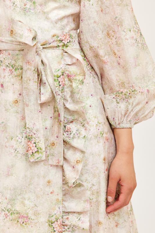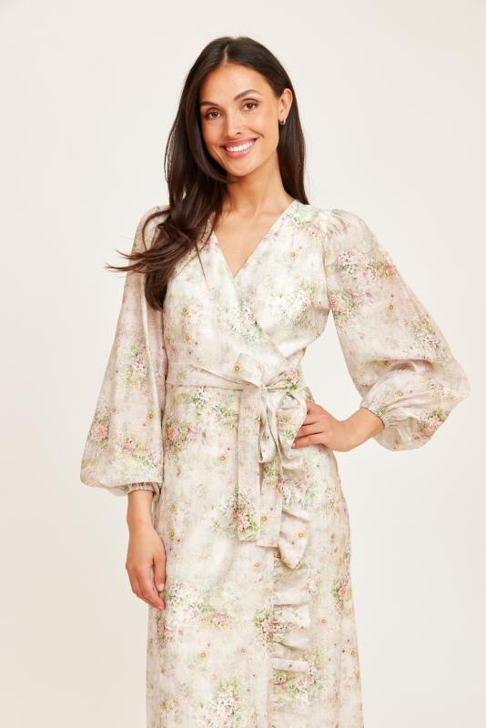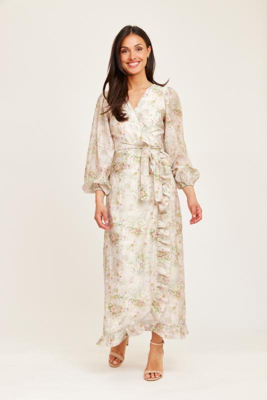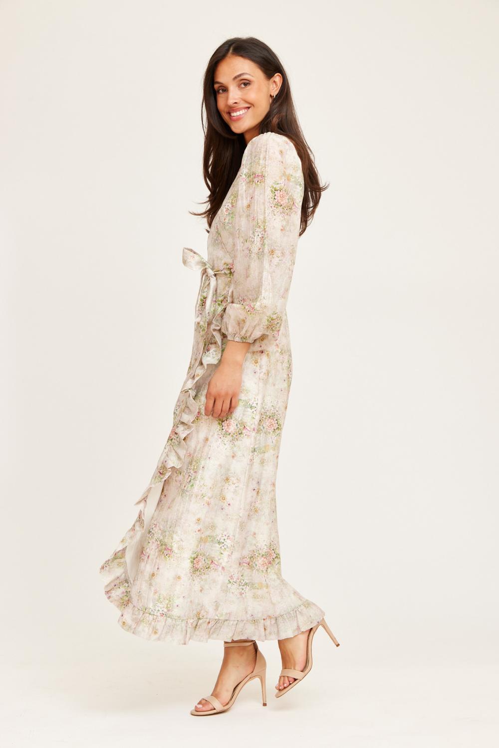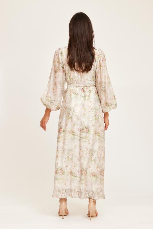 Ankellång omlottklänning i offewhite botten med blommönster i rosa, grönt, gult.