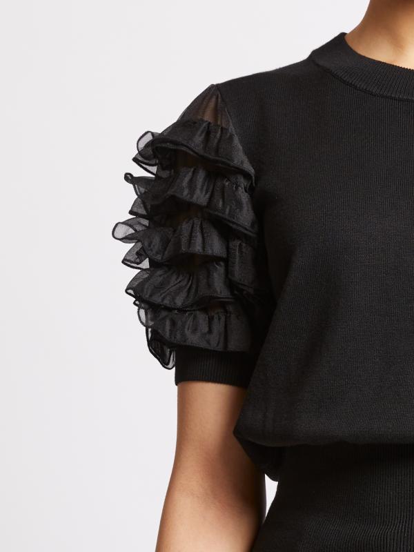 Svart stickad topp med kort genombruten puffärm i svart chiffong.