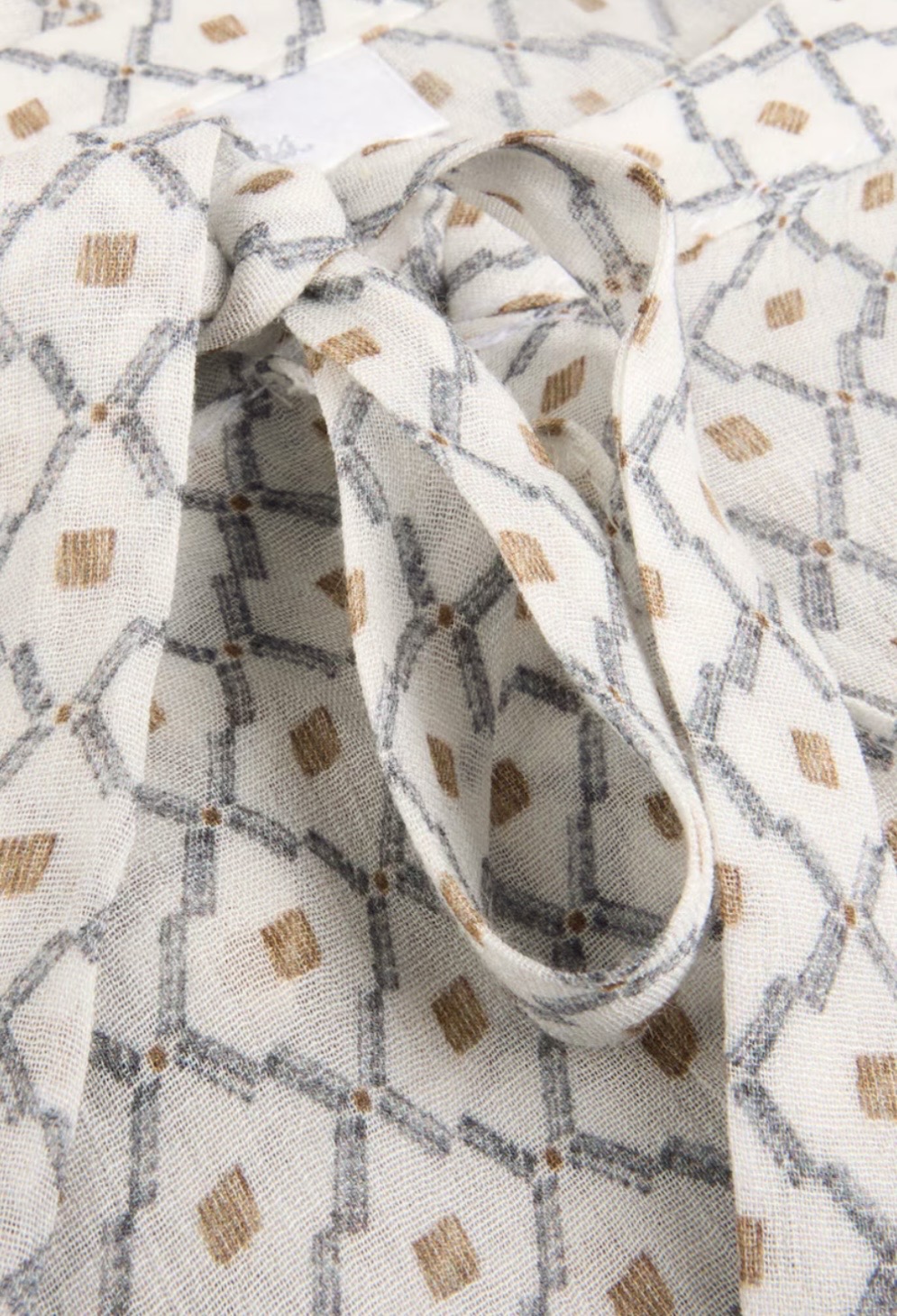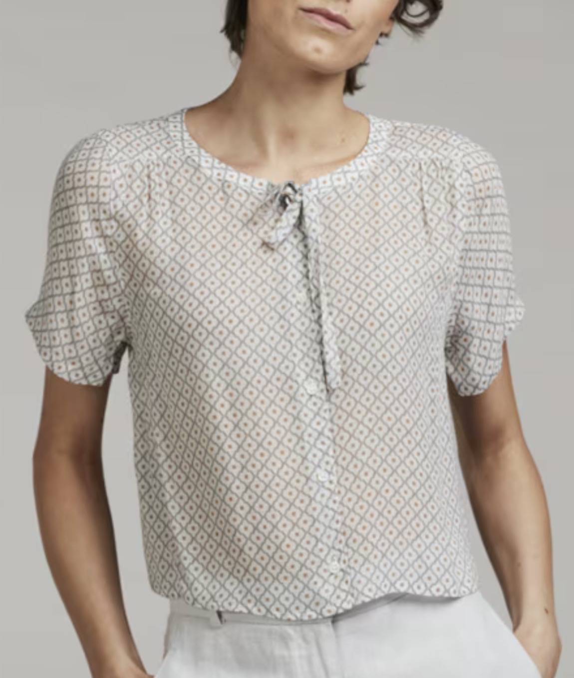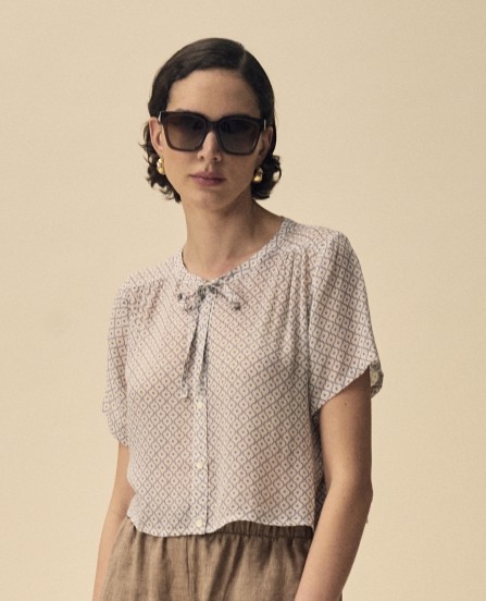 Offwhite blus med geometriskt mönster i ljusblått och ljusbrunt.