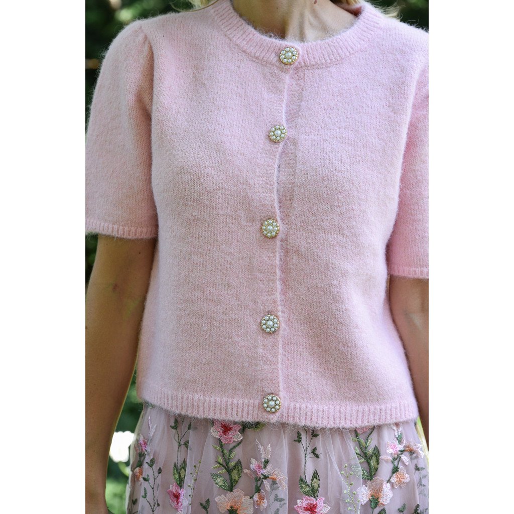 Ljusrosa kortärmad stickad kofta med guldfärgade knappar med pärlor på.