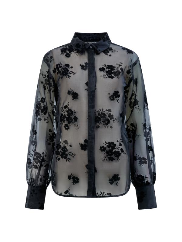 Svart skjorta i organza med flossat blommönster.