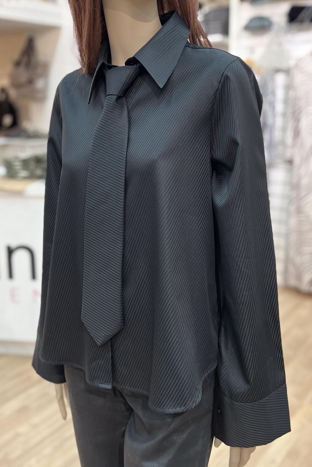 Svart skjorta med ton i ton ränder och slips som matchar.
