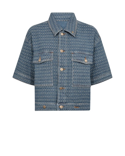 Blå kortärmad jacka med beige mönster i ett kraftigt vävt tyg.
