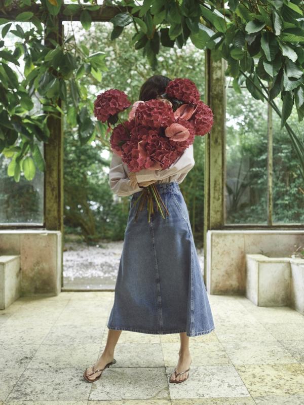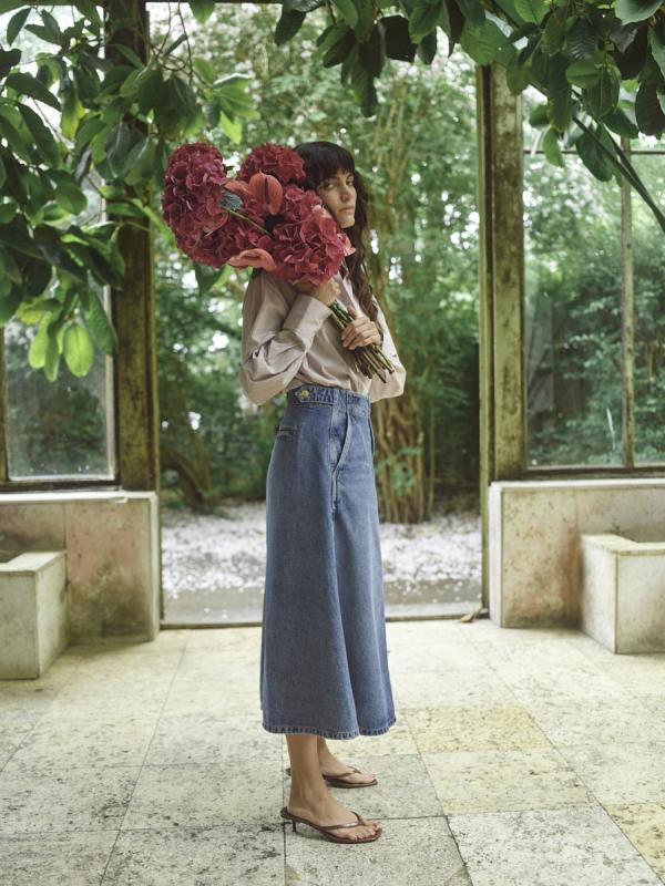 Ljusblå utställd vadlång jeanskjol.