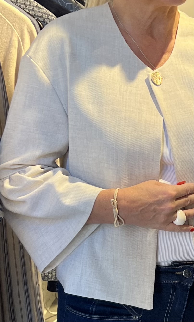Beigemelerad kort jacka i rak passform med utställd ärm.
