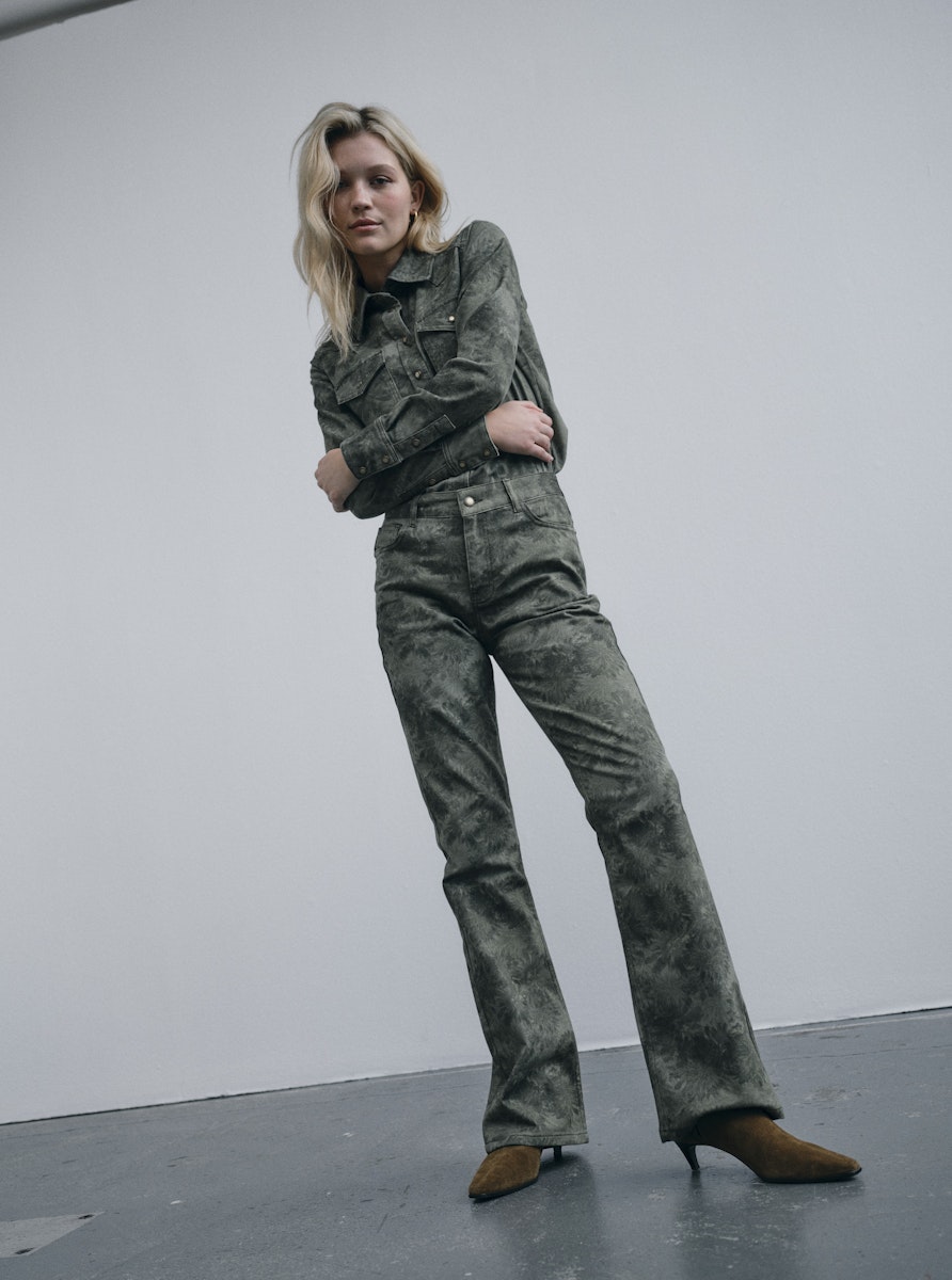Mönstrad byxa i gröna toner med något utsvängda ben och hög midja.