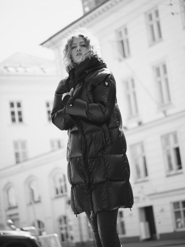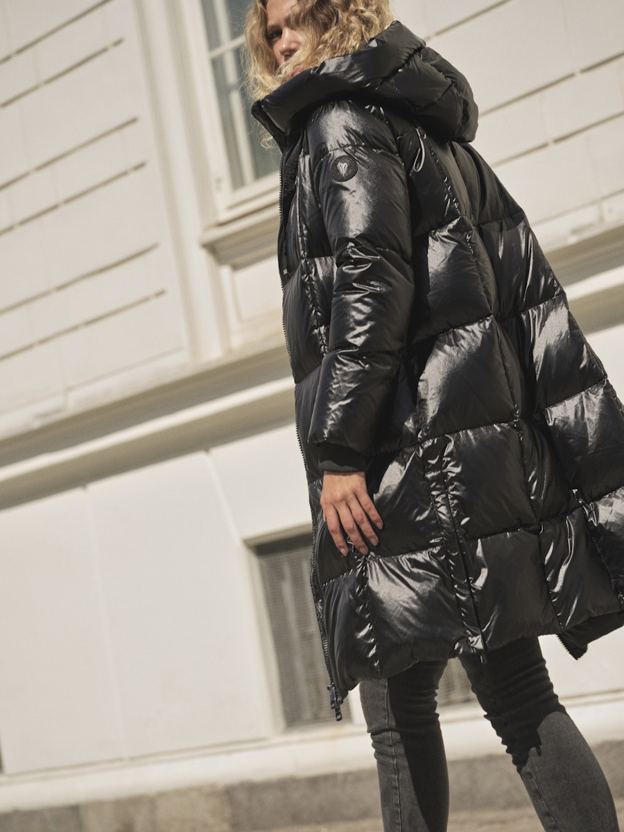 Dunkappa i blank svart metallic med fin luva/krage, detaljer ton i ton, logo band i luvan.