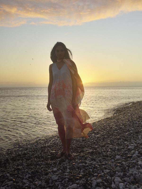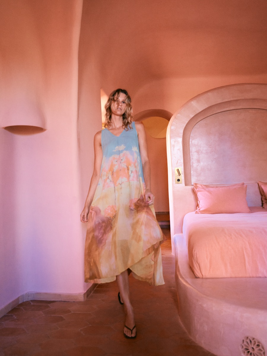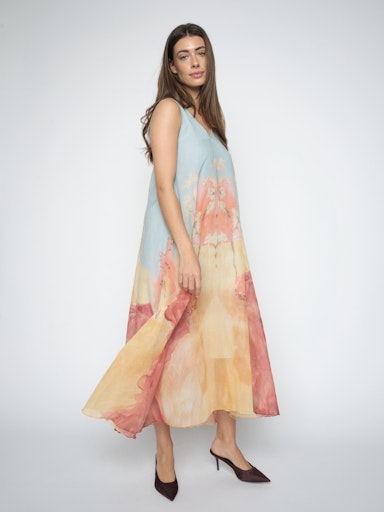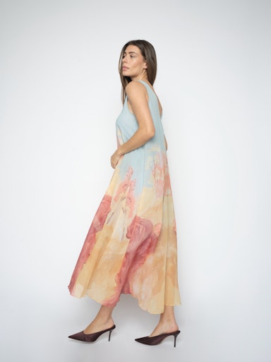 Vadlång a-linjeformad klänning med mycket vidd nertill, ljusblå upptill och handmålat print.