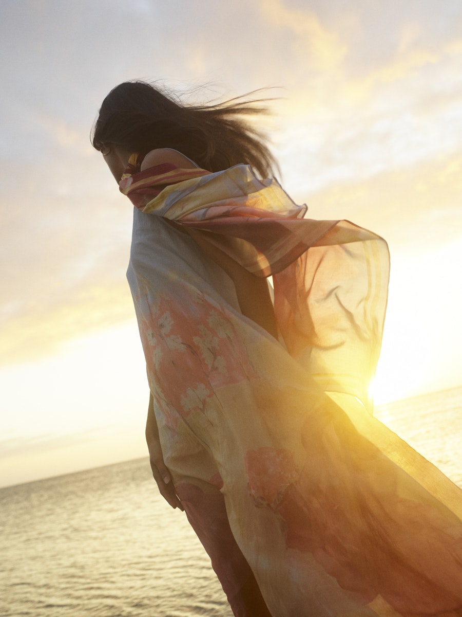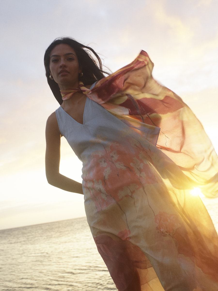 Vadlång a-linjeformad klänning med mycket vidd nertill, ljusblå upptill och handmålat print i dova röda toner och gult.