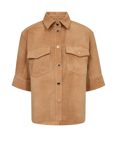 Ljusbrun mocka jacka med kort ärm och guldfärgade knappar.