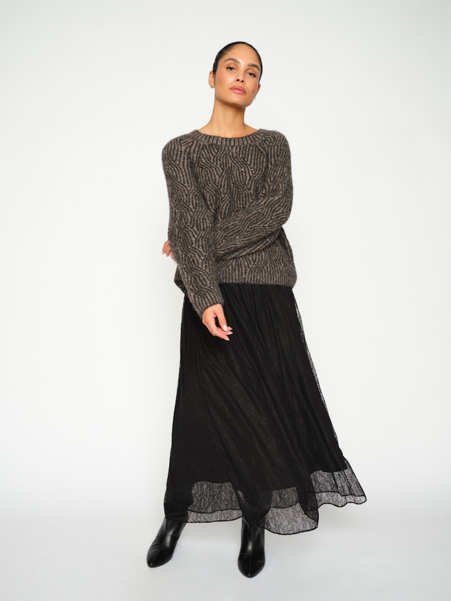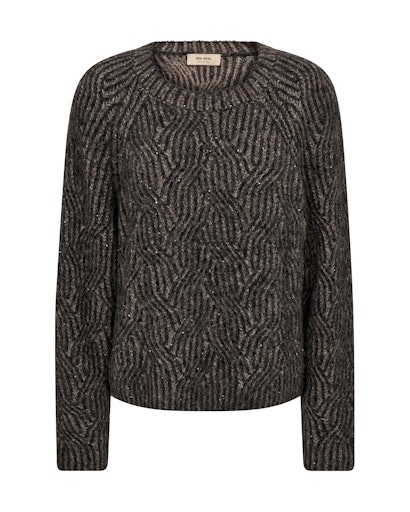 Mörkgrå/beige stickad tröja i abstrakt randig mönster och med små utspridda paljetter.