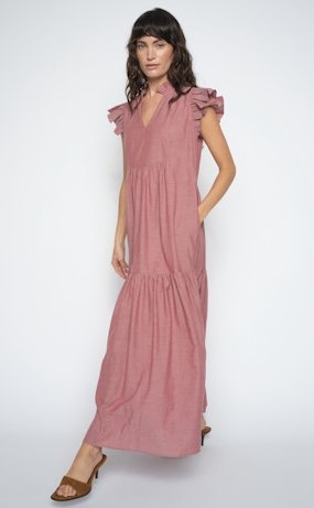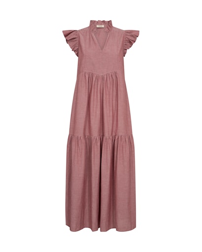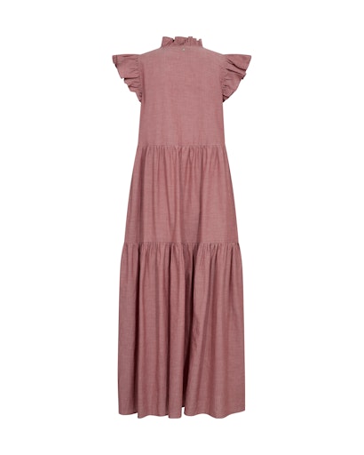 Lång klänning i dov röd med kort volangärm och volang nertill.