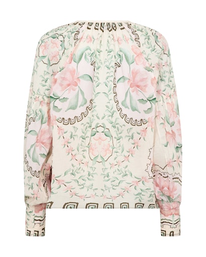 Blommig blus med offwhite botten och mönster i rosa, grönt och svart.