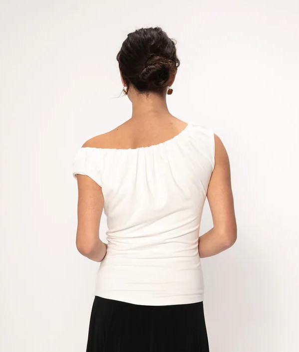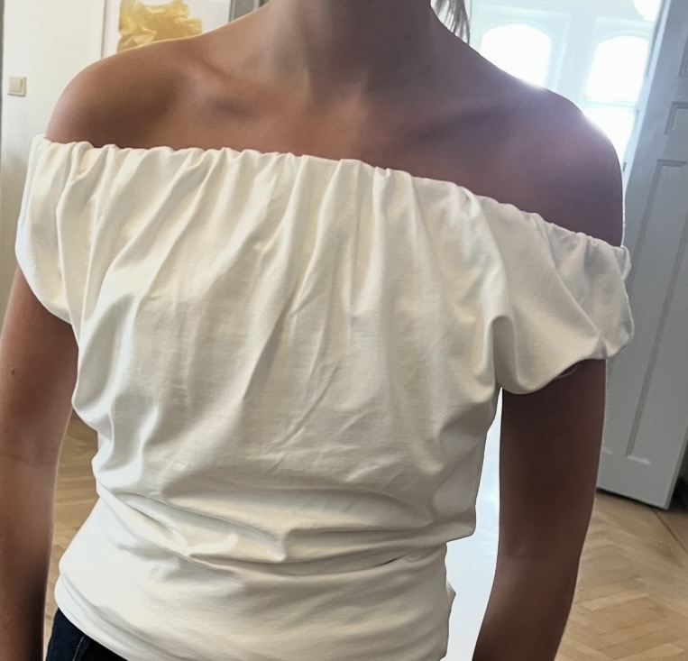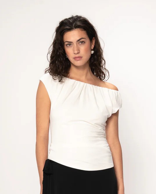 Offwhite topp i kraftg trikå med draperad/rinkad resårkant upptill.