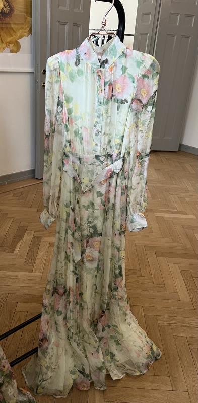 Hellång klänning med blommigt mönster i grönt, rosa, gult och vitt.