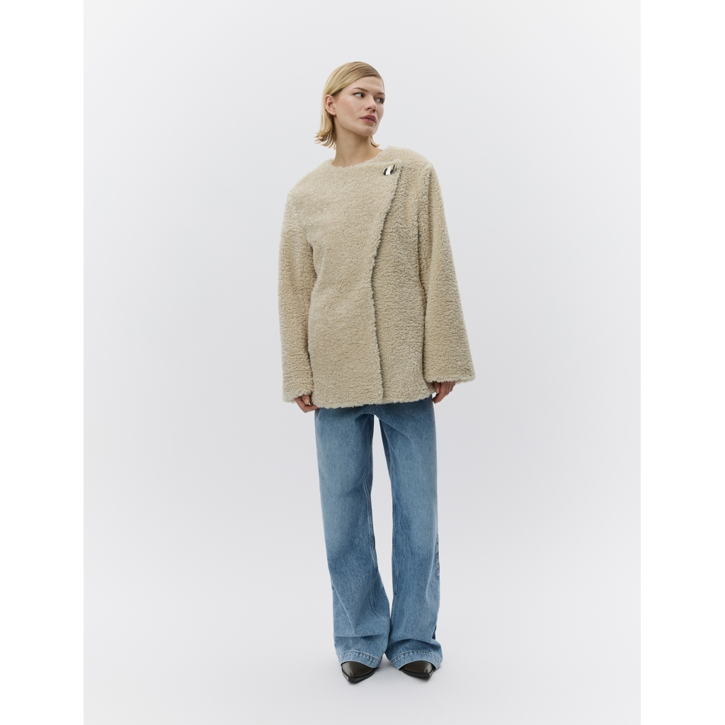 Krämfärgad teddyjacka med asymmetrisk knäppning med hakar.
