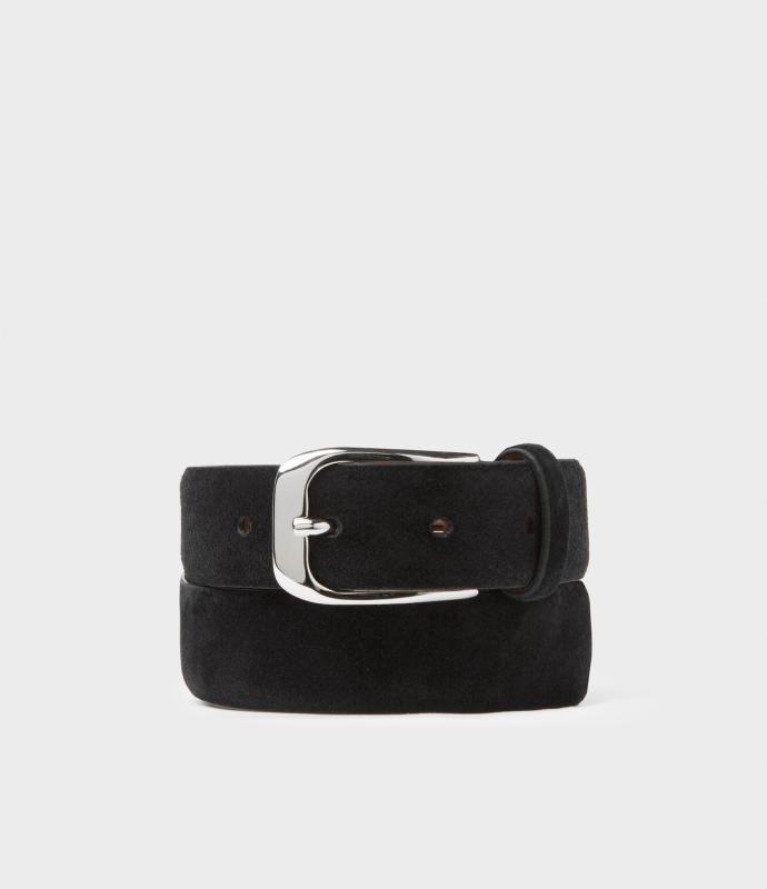 Klassiskt bälte i svart mocka. Stilfullt spänne i blank silverfärgad metall.