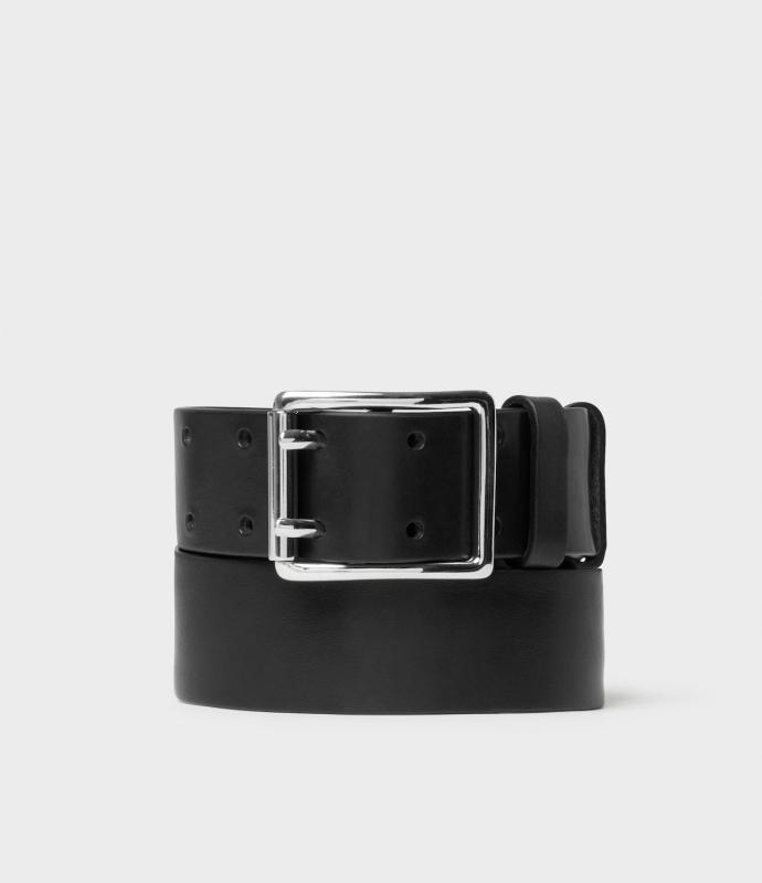 Svart brett bälte med kraftigt spänne och dubbel prång. Fler hål än vanligt så det är enkelt att anpassa både till midja och höftvidd.