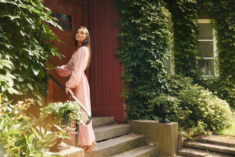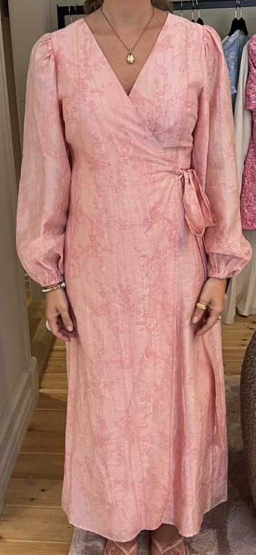 Rosa ankellång omlottklänning i mönstrat ton i ton tyg.