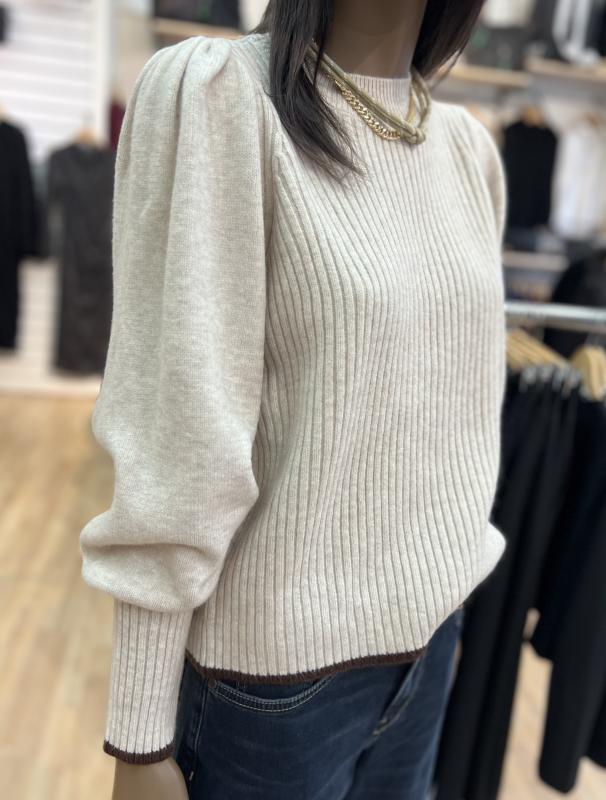 Krämfärgad stickad tröja med puffärm och hög hals.