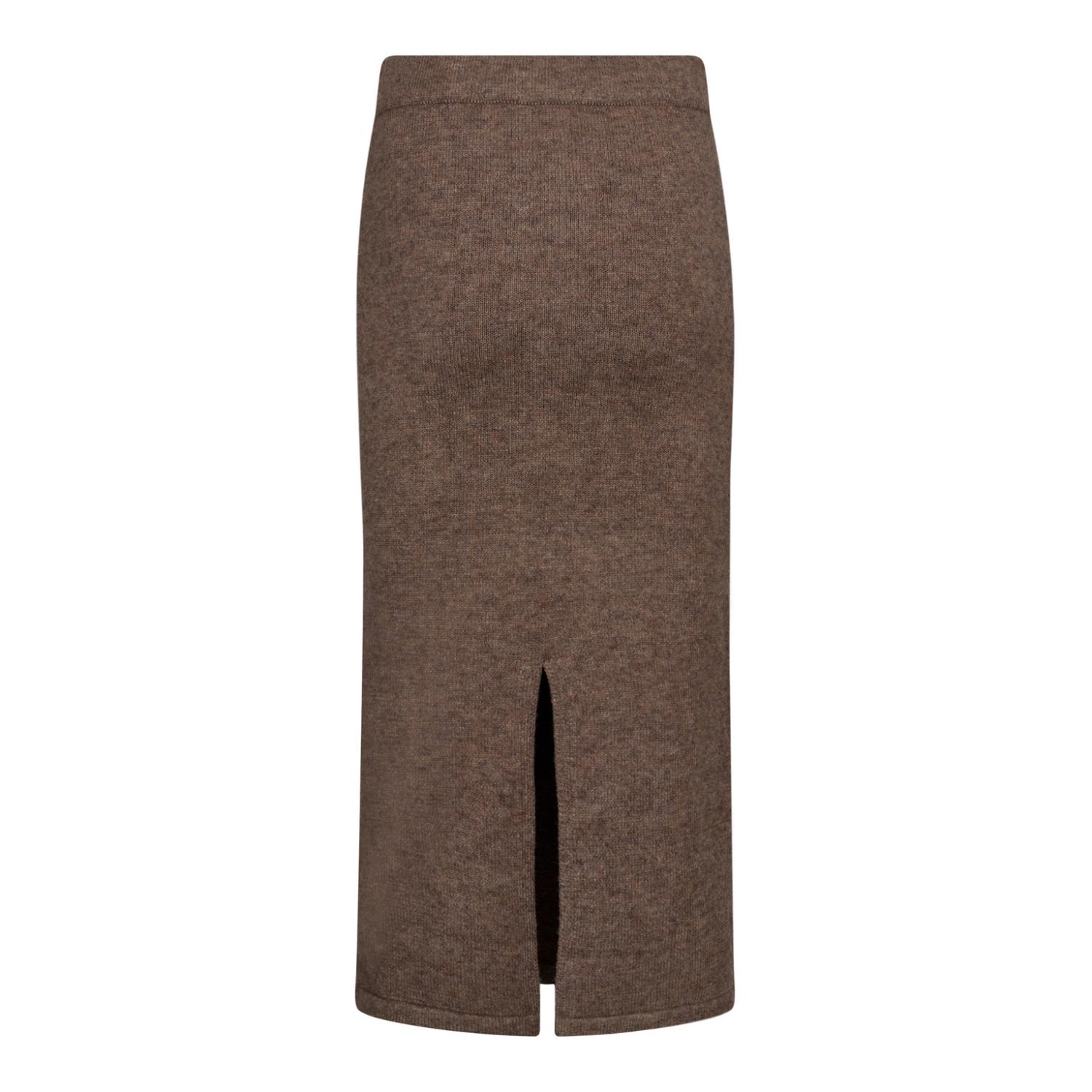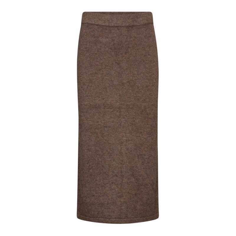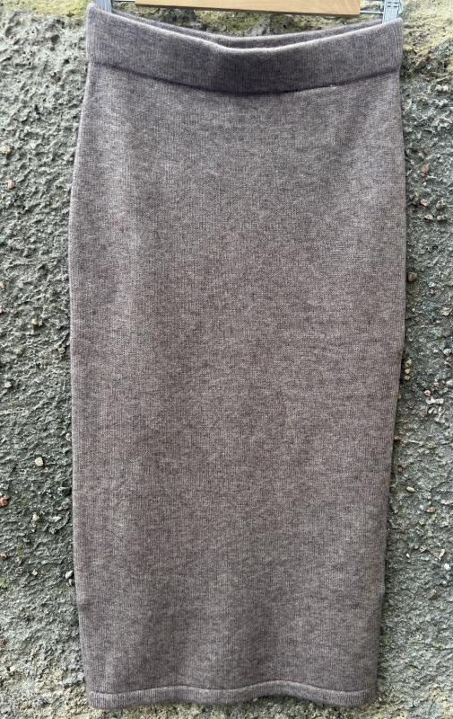 Stickad valnötsfärgad kjol med sprund bak och resår i midjan.
