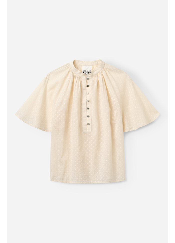 Krämfärgad genombruten blus, mönstrad med broderade prickar.