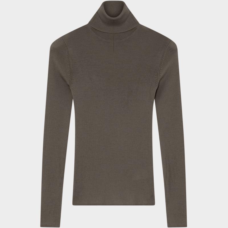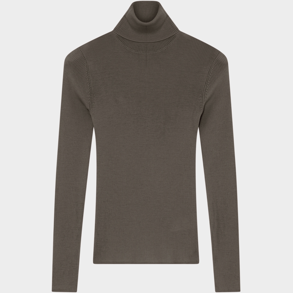 Stretchig brun tunn ribbstickad merinoullspolo.
