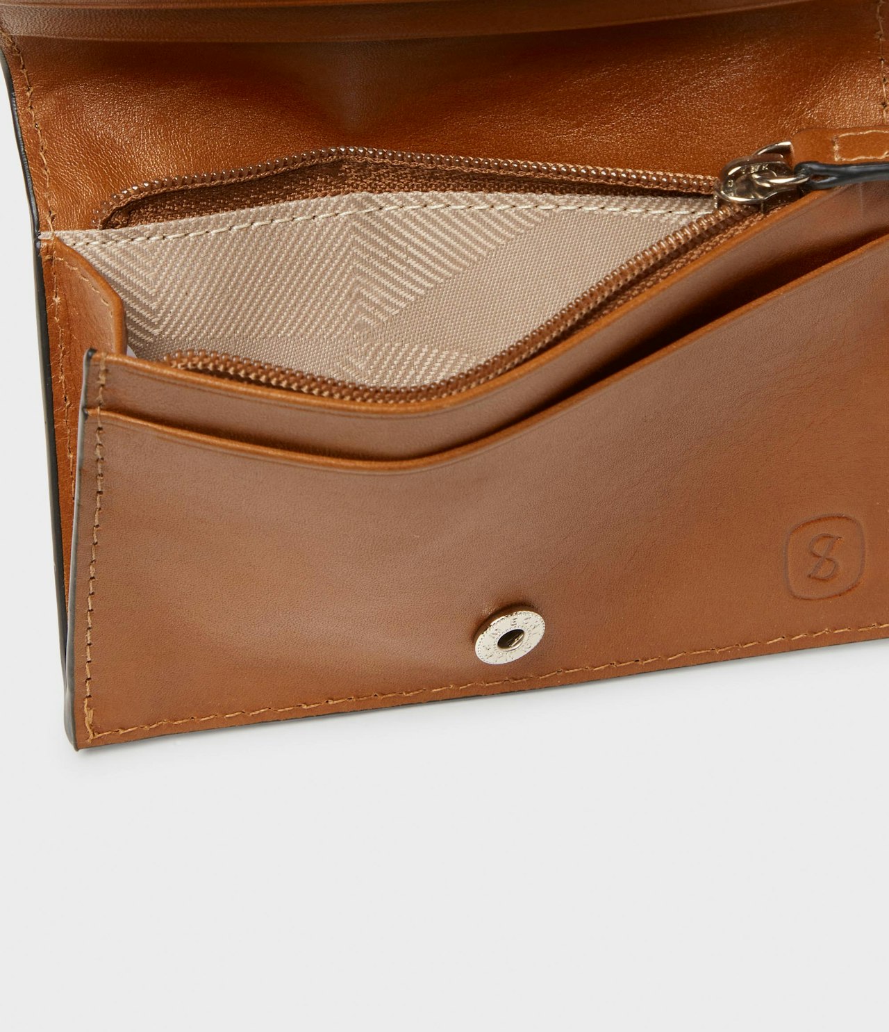 Brun plånbok tillverkad i flätat full grain koläder, certifierat av Leather Working Group. Plånboken har fyra kortfack och ett myntfack med dragkedja. Embossad Saddler-logo på insidan. Plånboken har ett skyddande RFID-membran i fodret. Insidan är fodrad i polyester. Plånboken försluts med tryckknapp. Hårdvara i blank nickelfärgad metall.
