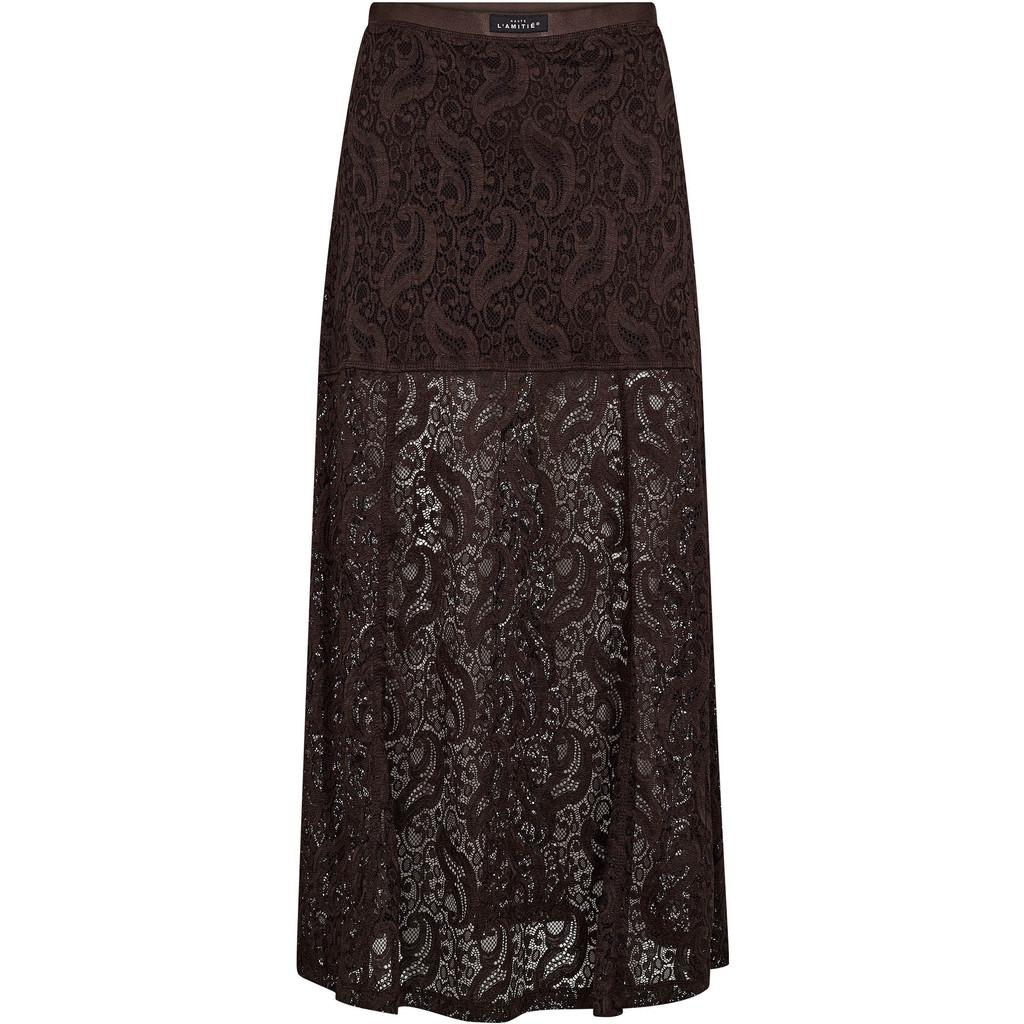 Mörkbrun ankellång spetskjol med resår i midjan.