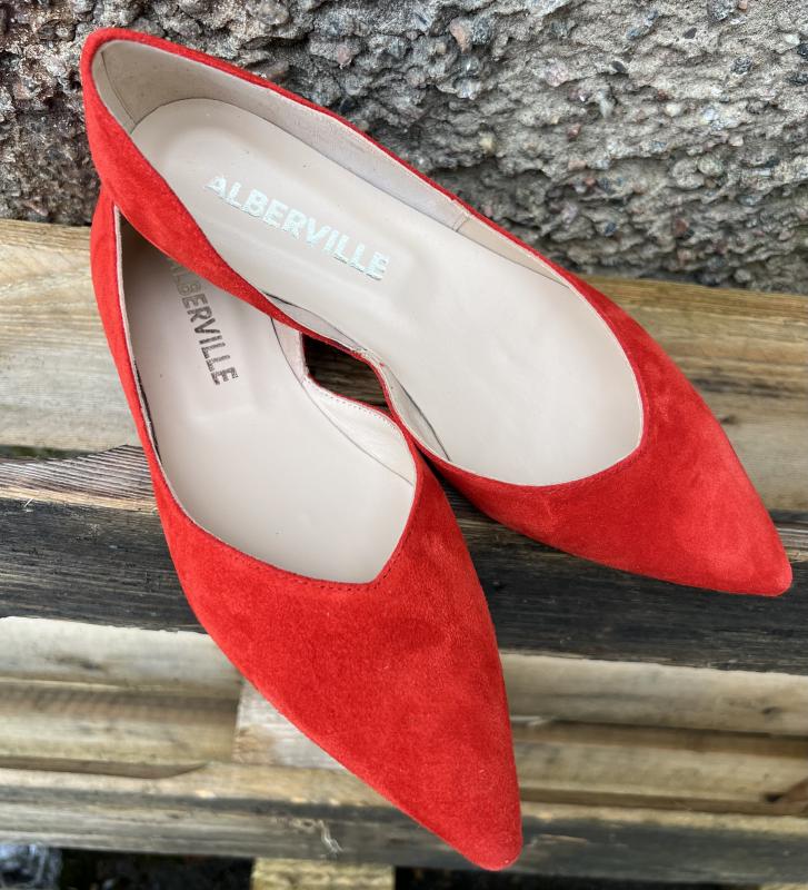 Röd i ballerina i mocka med spetsig tå.