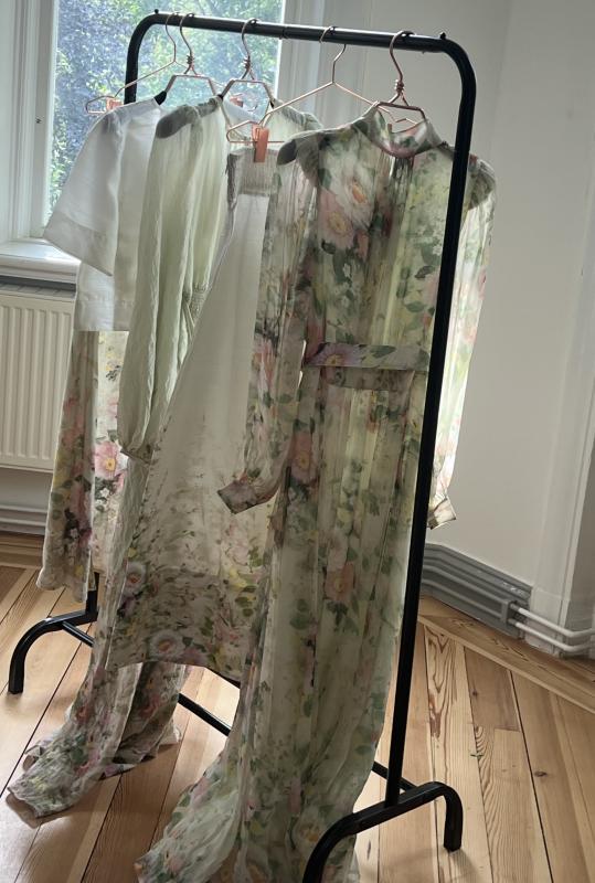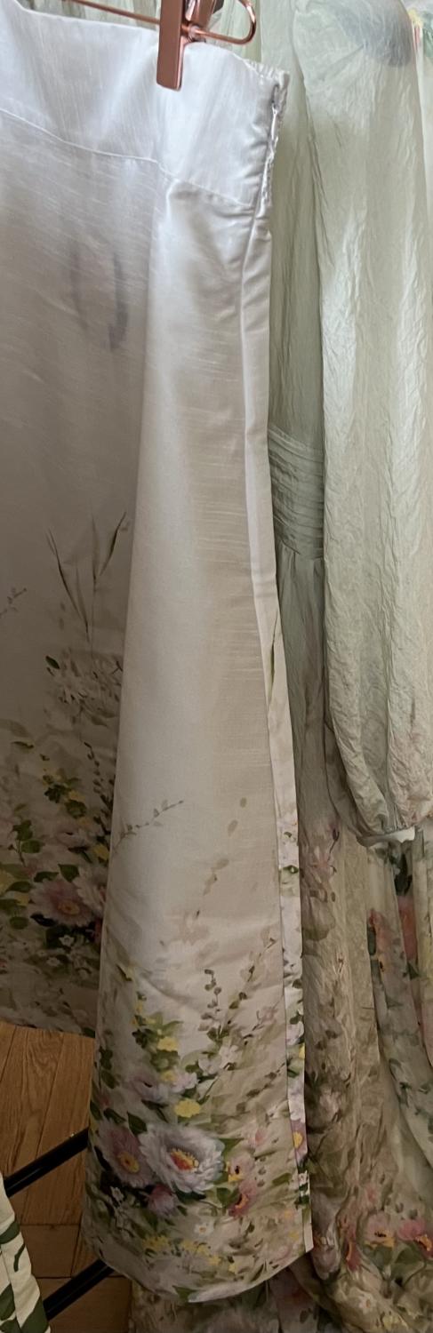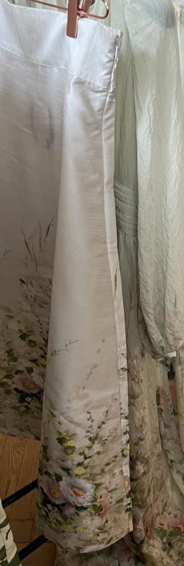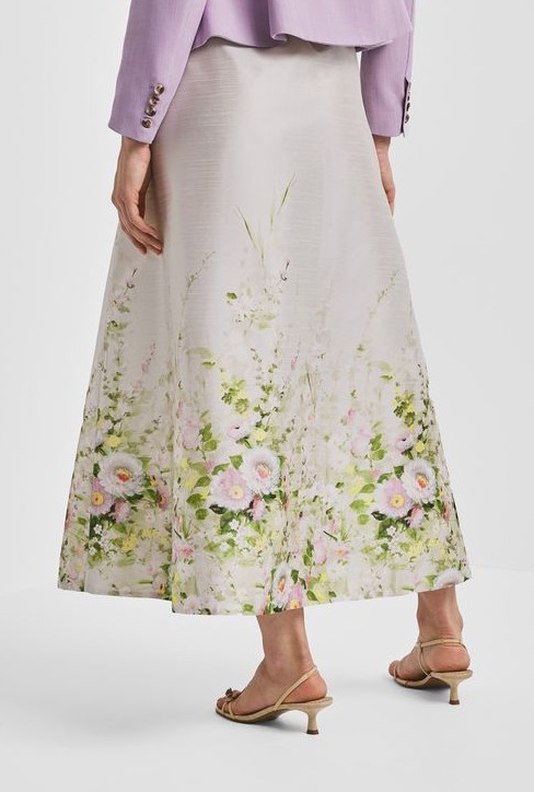Ankellång utställd kjol med blommigt mönster nertill i grönt, rosa, gult och vitt.