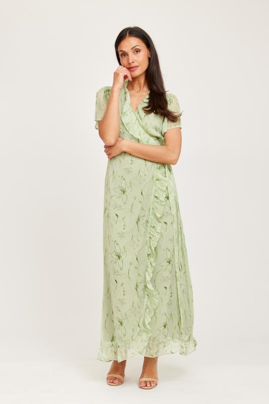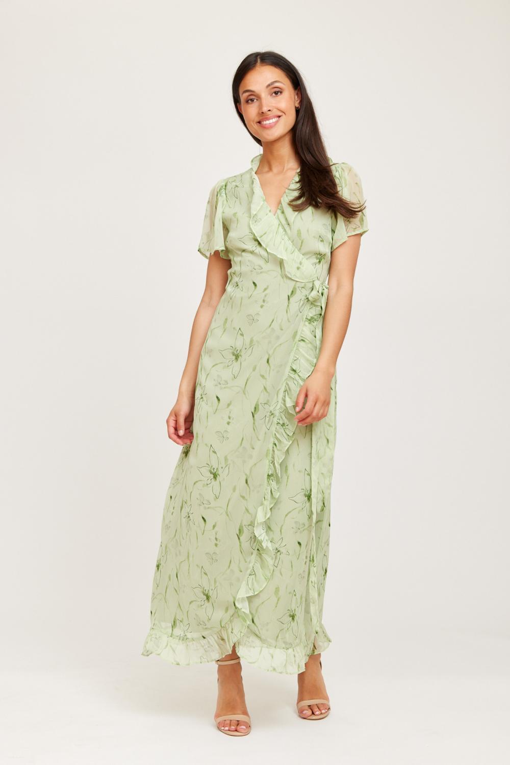 Ljusgrön omlottklänning i chiffong med mönster i mörkare grönt.