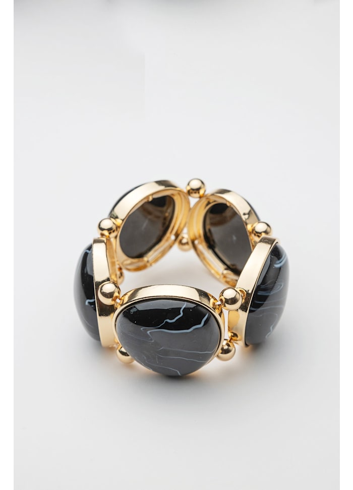Guldfärgat elastiskt armband med svarta marmorerade ovaler.