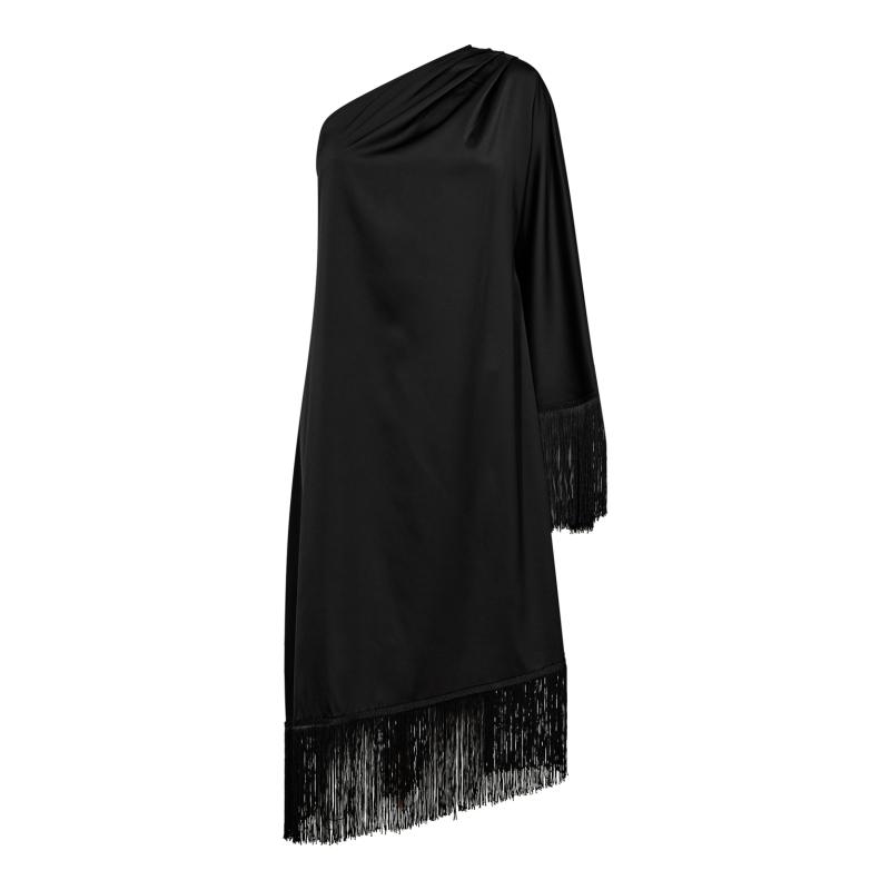 Svart glansig oneshoulder klänning med fransar nertill och i ärmslutet.