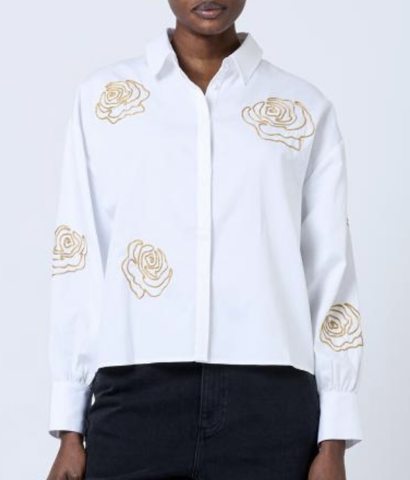 Vit något boxig skjorta med broderade konturer av rosor i guld på framsidan.