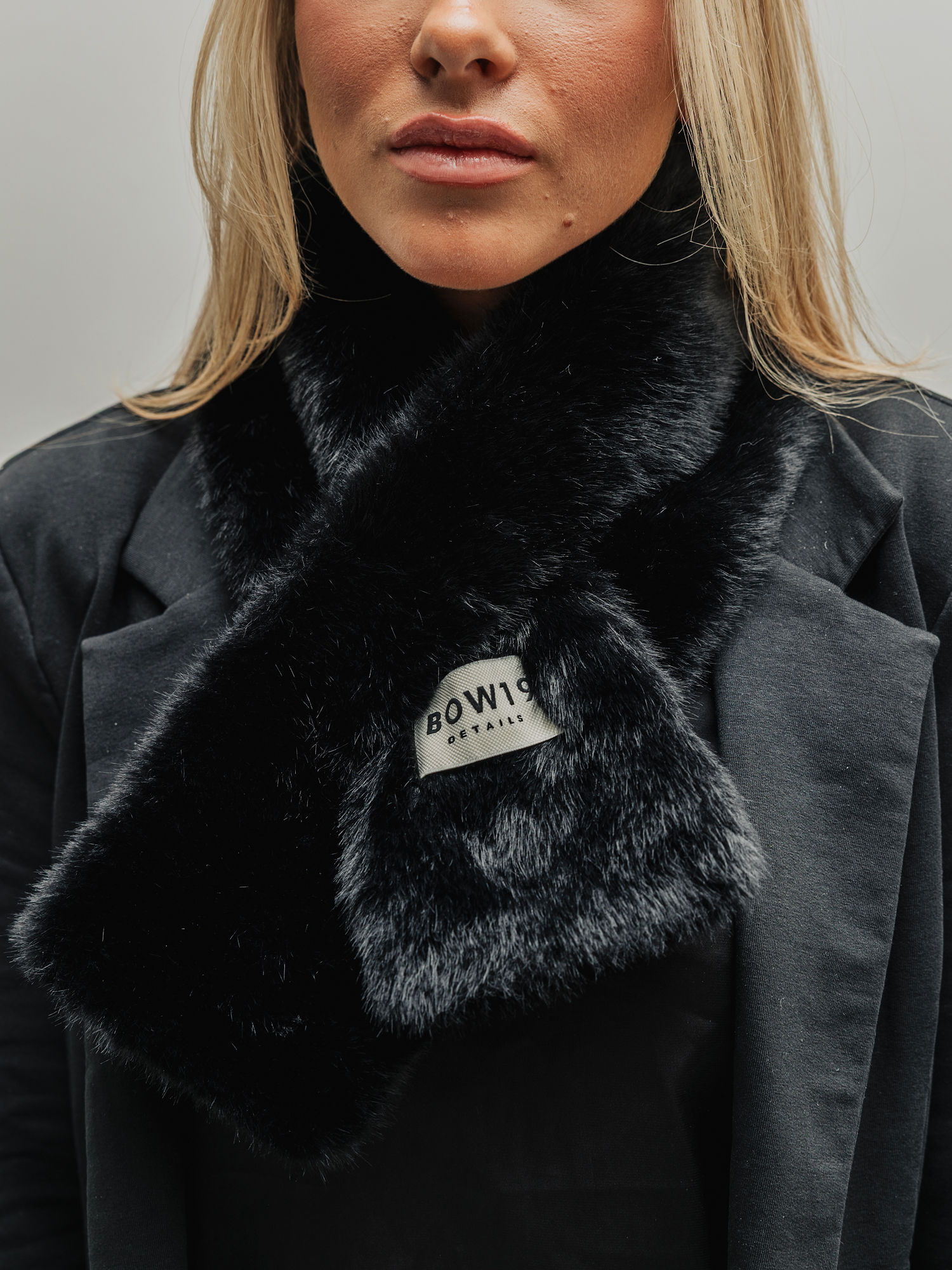 Kort svart halsduk i fuskpäls med hål för att trä genom.